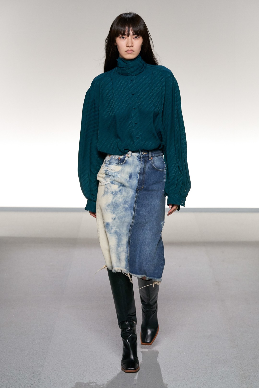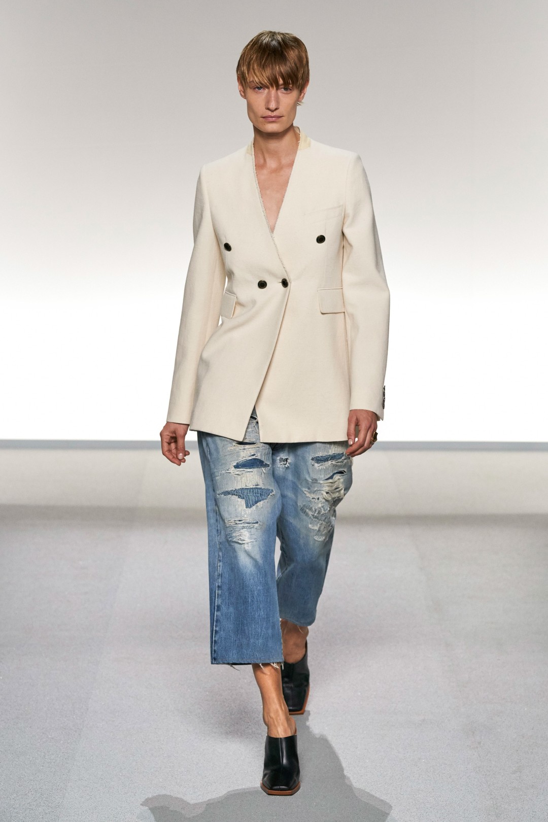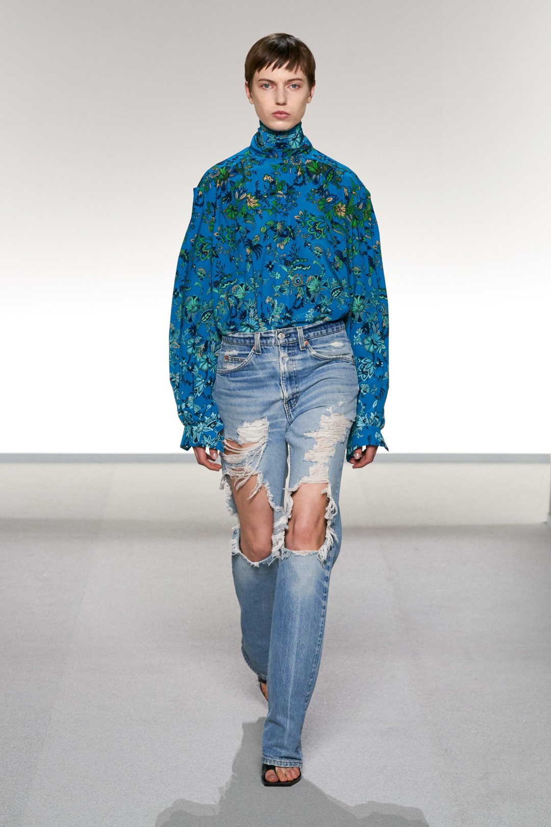 Классические костюмы в «гусиную лапку», кожаные юбки с завышенной талией, белые жакеты, надетые вместе с драными джинсами, и нюдовые бра, выполненные из нежнейшего шелка, напоминали революционный для 1990-х годов минимализм. Только на этот раз стайлинг им делали вещи с «парижским шиком»: блузы с объемными рукавами, джемперы с цветочной вышивкой, платья со сложными драпировками и кружевные туники.