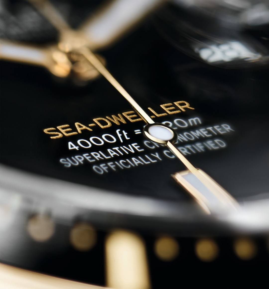 На черном циферблате выделяется надпись Sea-Dweller желтого цвета, сочетающаяся с 18-каратным золотом. Игра света на дужках и боковых сторонах корпусного кольца подчеркивает форму корпуса Oyster диаметром 43 мм, оснащенного вращающимся в одну сторону безелем с диском Cerachrom из черной керамики с градуированной 60-минутной шкалой.