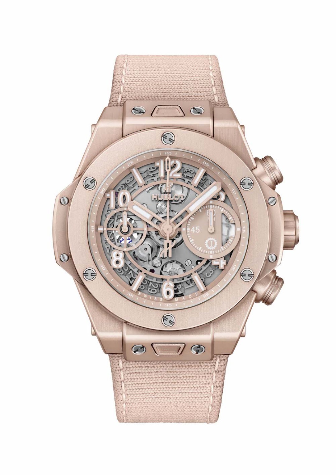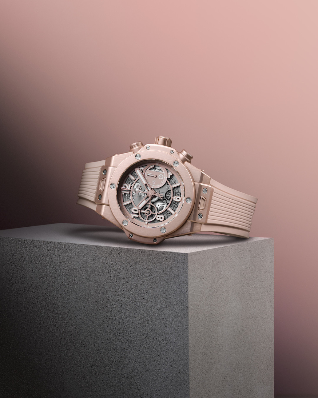 42-миллиметровый корпус изготовлен из инновационного легкого алюминия — монохромного материала. Особый розовый оттенок millennial pink получается путем анодирования — процесса, который одновременно защищает и украшает. Именно он придает корпусу и его компонентам желаемый пастельный оттенок и наделяет его исключительной стойкостью к царапинам и ударам. Создание корпуса с такими характеристиками стало возможным благодаря исследованиям, проведенным инженерами Hublot.