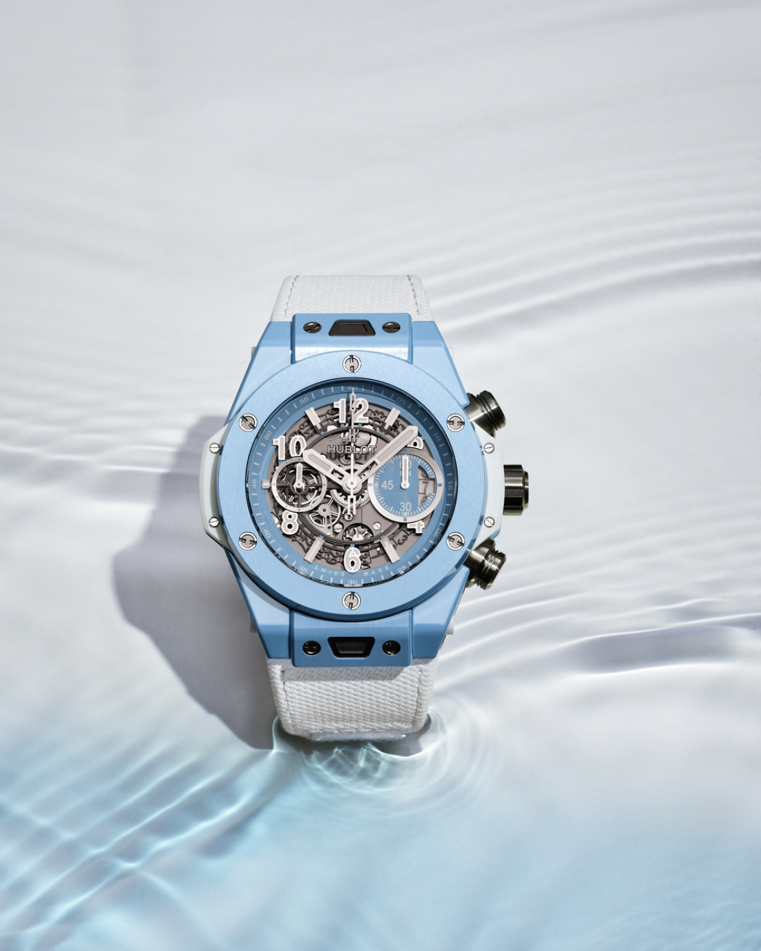 Big Bang Unico Sky Blue объединяет в себе два основных принципа Hublot — сочетание традиций и инноваций. Модeль часов представлена ограниченной серией в 100 экземпляров. 45-миллиметровый корпус выполнен из полированной и сатинированной голубой керамики. Еще в 2019 году Hublot впервые в мире запатентовала производство керамики ярких цветов, с тех пор почти все цвета Pantone появились в линейке бренда. Керамика — это не только красиво, но и долговечно. Это сверхпрочный материал на основе циркония, который можно поцарапать только алмазом. Циферблат надежно спрятан под сапфировое стекло с антибликовым покрытием. Завершает образ Big Bang Unico Sky Blue белый ремешок из ткани с застежкой из керамики небесно-голубого цвета.