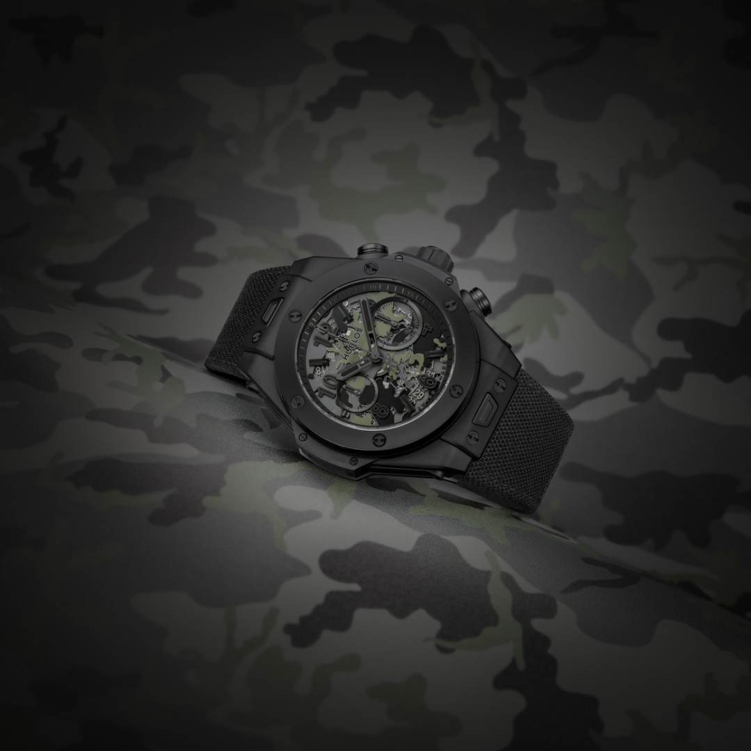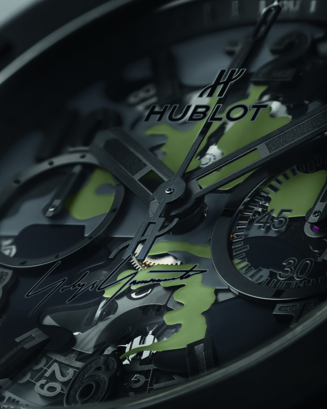 Часы Big Bang Camo Yohji Yamamoto выпущены ограниченной серией всего в 200 экземпляров. Новая модель представлена в корпусе из матовой черной керамики. Диаметр ее сапфирового циферблата 45 мм, он украшен накладными деталями, которые образуют биоморфный узор — это отсылка к камуфляжному орнаменту, который стал лейтмотивом этой модели. Подпись дизайнера расположилась на циферблате в положении «6 часов». Оригинальная конструкция камуфляжного мотива присутствует и на ремешке: каждая из составных форм вырезается по отдельности, собирается, а затем сливается воедино с помощью процесса вулканизации. Второй ремешок выполнен из черной ткани. Часы Big Bang Camo Yohji Yamamoto оснащены мануфактурным механизмом Unico с 72-часовым запасом хода.