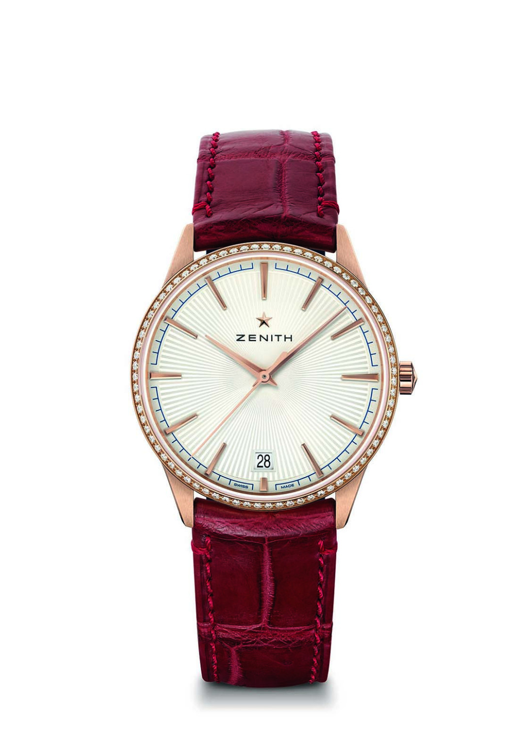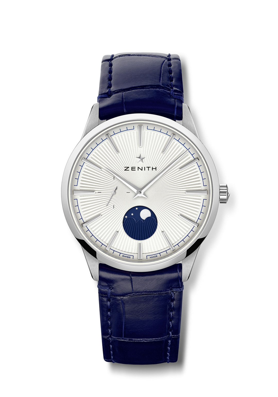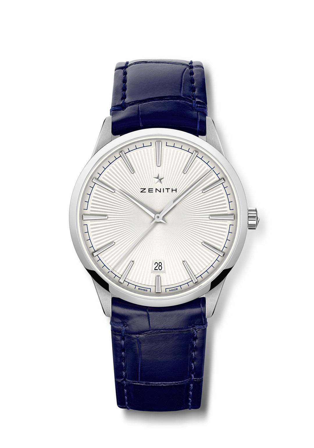 Модель Elite Classic оснащена серебристым циферблатом с круговым узором «Солнечные лучи», образованным тонкими линиями, расходящимися из центра. Такой рисунок создает эффект бликов и теней, а усиливают эту визуальную глубину граненые и полированные конические метки. Над циферблатом «парят» стрелки Dauphine – это одна из самых изысканных форм часовых стрелок, напоминающая о моделях Zenith середины 20 века. Ультратонкий и заслуживающий внимания по своим характеристикам калибр Elite обеспечивает запас хода в 50 часов.