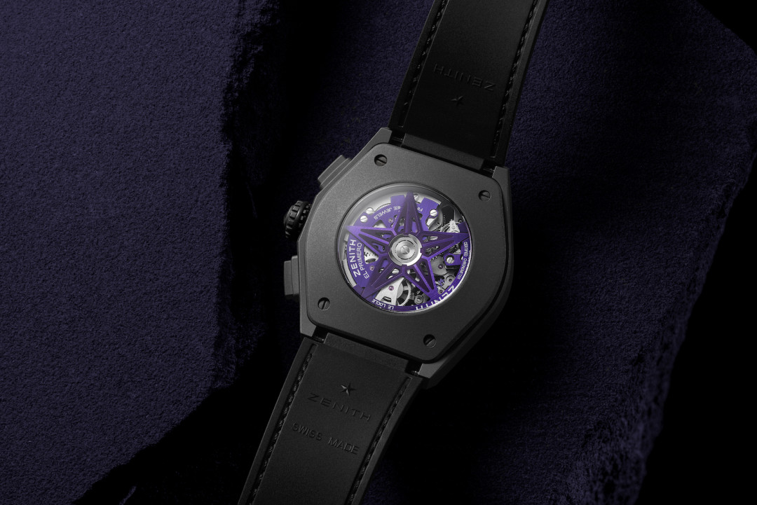 Zenith Defy 21 Ultraviolet — скелетонизированный хронограф с ярким фиолетовым механизмом, работающим с частотой 50 Гц и способным измерять отрезки времени с точностью до 1/100 секунды. Центральная секундная стрелка с белым наконечником совершает один полный оборот вокруг циферблата за одну секунду. А благодаря открытому циферблату с тремя серыми счетчиками и серым фланцем механизм хорошо заметен, и именно он задает общее настроение.