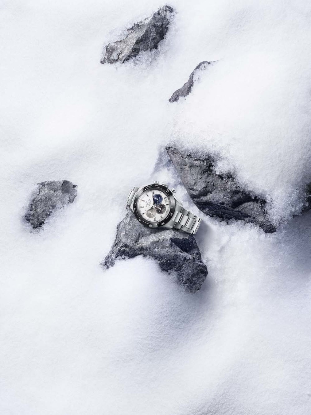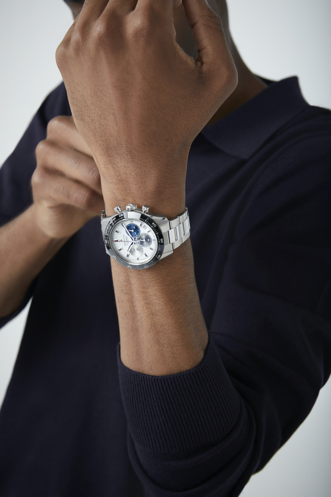 Новинка обладает изысканным циферблатом, интегрированным стальным браслетом максимально комфортной формы, усовершенствованной отделкой, более точными пропорциями и чрезвычайной точностью до десятой доли секунды. Новые часы Chronomaster Sport представлены в элегантном и прочном стальном корпусе диаметром 41 мм с кнопками типа «помпа». Ярким отличием Chronomaster Sport от предшественников является полированный черный керамический безель.