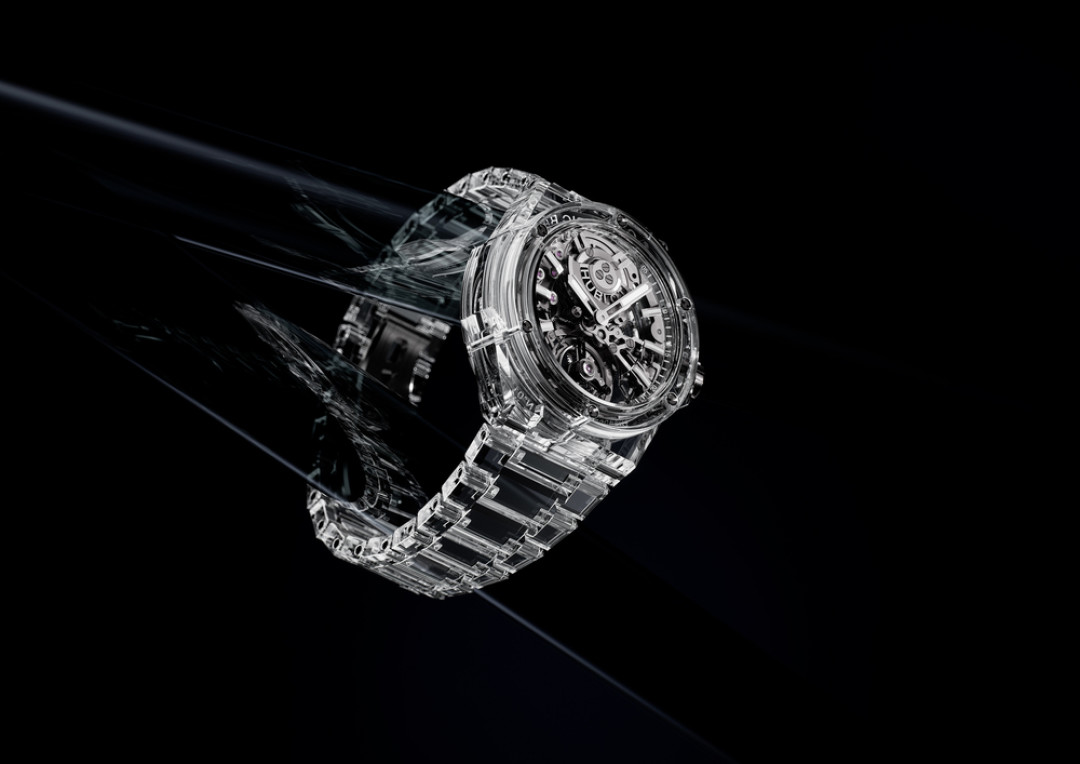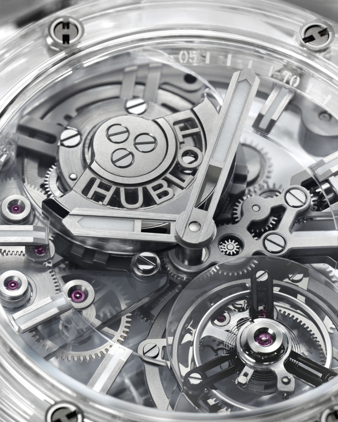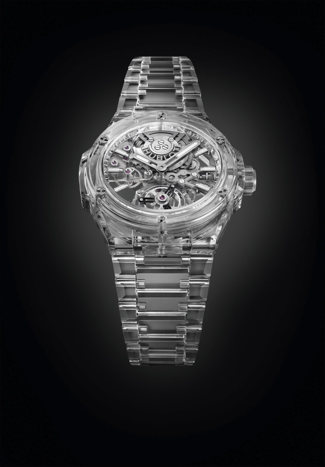 Для модели был выбран новый автоматический механизм с турбийоном и мостами из сапфира, прозрачность которого по-настоящему впечатляет. Некоторые детали часов могут увидеть только часовщики, которые их производили. Благодаря корпусу и браслету, выполненным полностью из сапфира, эта модель раскрывает свои секреты абсолютно для всех: механизм и корпус сливаются воедино и выставляют наружу каждый элемент своей конструкции. «Нам потребовалось пять лет, чтобы воплотить в жизнь наш первый корпус из сапфира, и почти столько же времени ушло на создание первого браслета. Производство обеих деталей из сапфира и их объединение в единое целое ознаменовало собой кульминацию серьезной работы, проделанной всеми командами компании Hublot», — отмечает Рикардо Гвадалупе, генеральный директор Hublot.