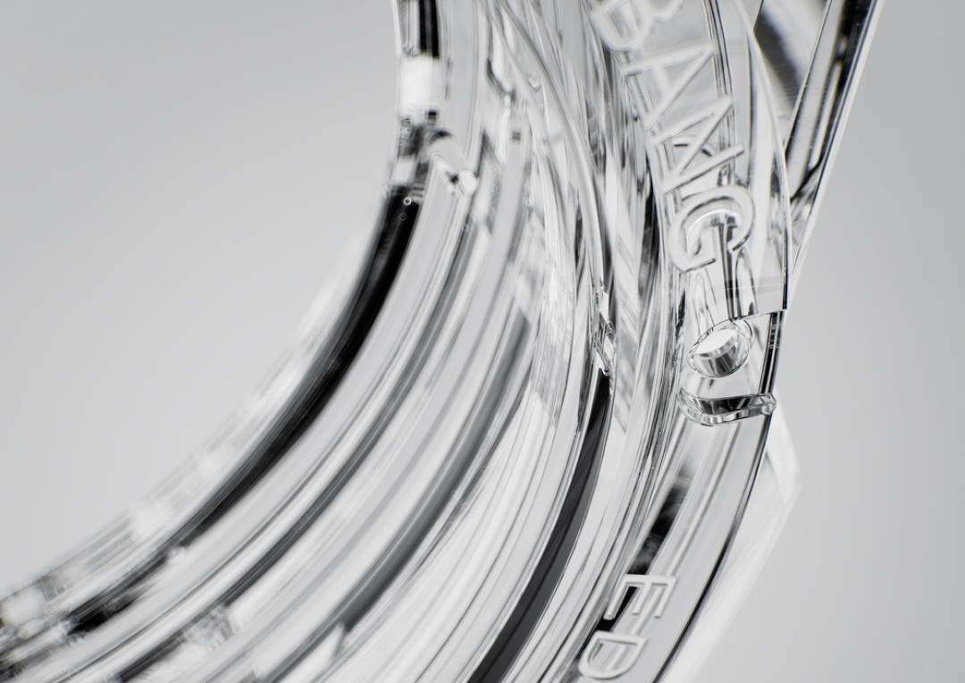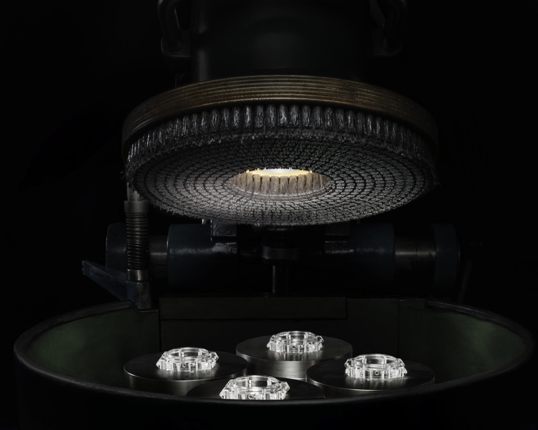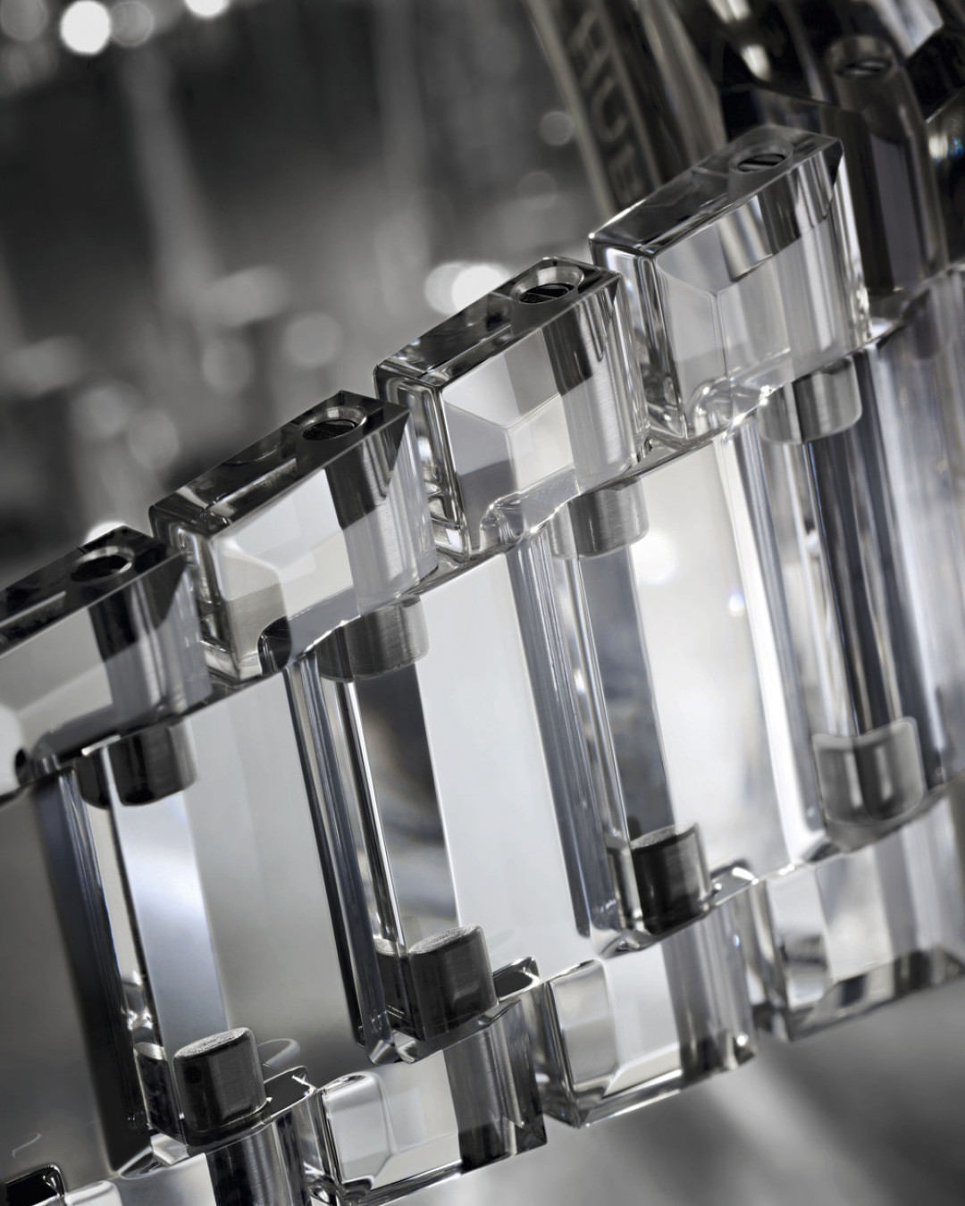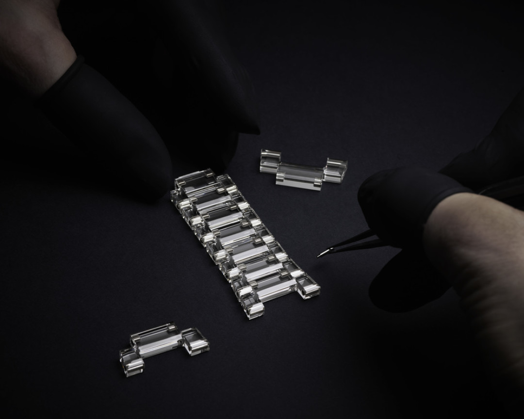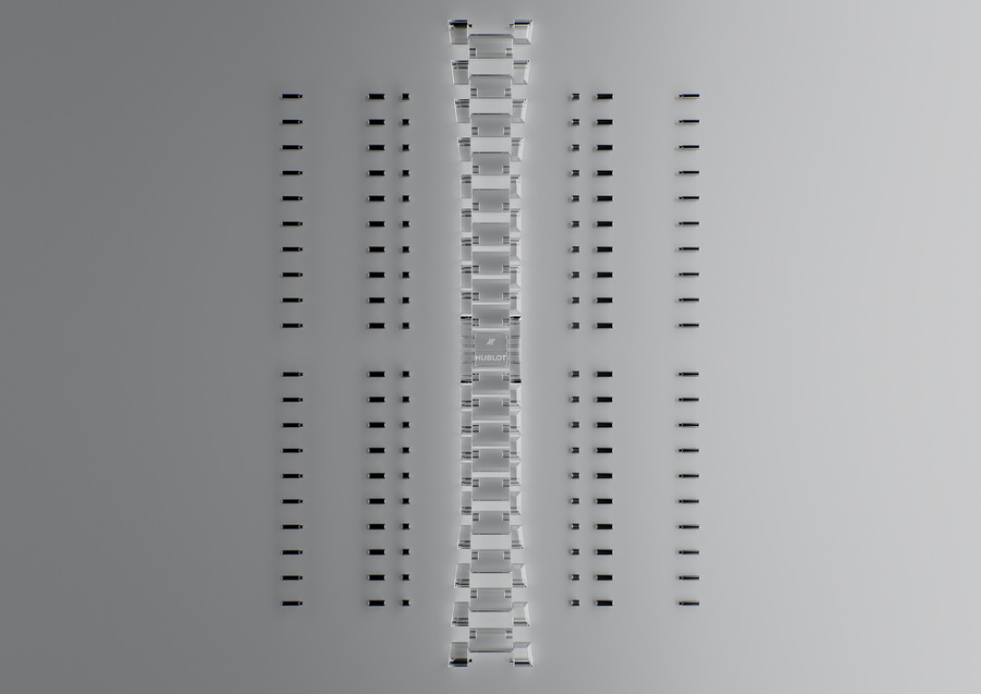 Разработка браслета также представляла собой сложную задачу: он состоит из 165 компонентов, 22 из которых изготовлены из сапфира. За каждым элементом стоит сложный производственный процесс. Особого внимания заслуживают титановые вставки, максимально уменьшенные в размерах, чтобы они не выступали с обеих сторон каждого звена браслета. Это инновационная технология впервые используется на мануфактуре Hublot, вероятно, и во всей часовой индустрии.