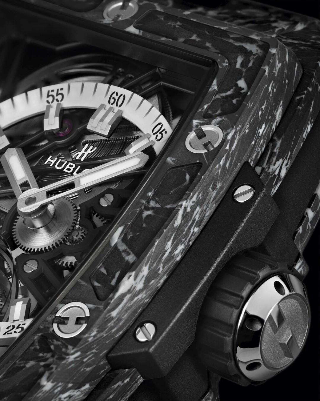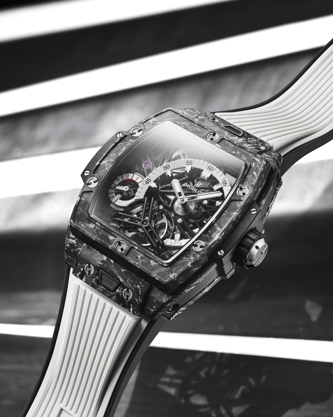 Модель Spirit of Big Bang Tourbillon 5-day Power Reserve Carbon White выпущена ограниченной серией из 100 экземпляров. Игра контрастов создана не только за счет дуализма черного и белого, но и за счет текстур: задняя крышка корпуса диаметром 42 мм и безель изготовлены из углеволокна с включениями из композитного материала, белые вкрапления из стеклянных нетканых микроволокон служат для повышения прочности материала. Циферблат выполнен из сапфирового стекла, через которое хорошо просматривается конструкция скелетонизированного мануфактурного механизма HUB6020.