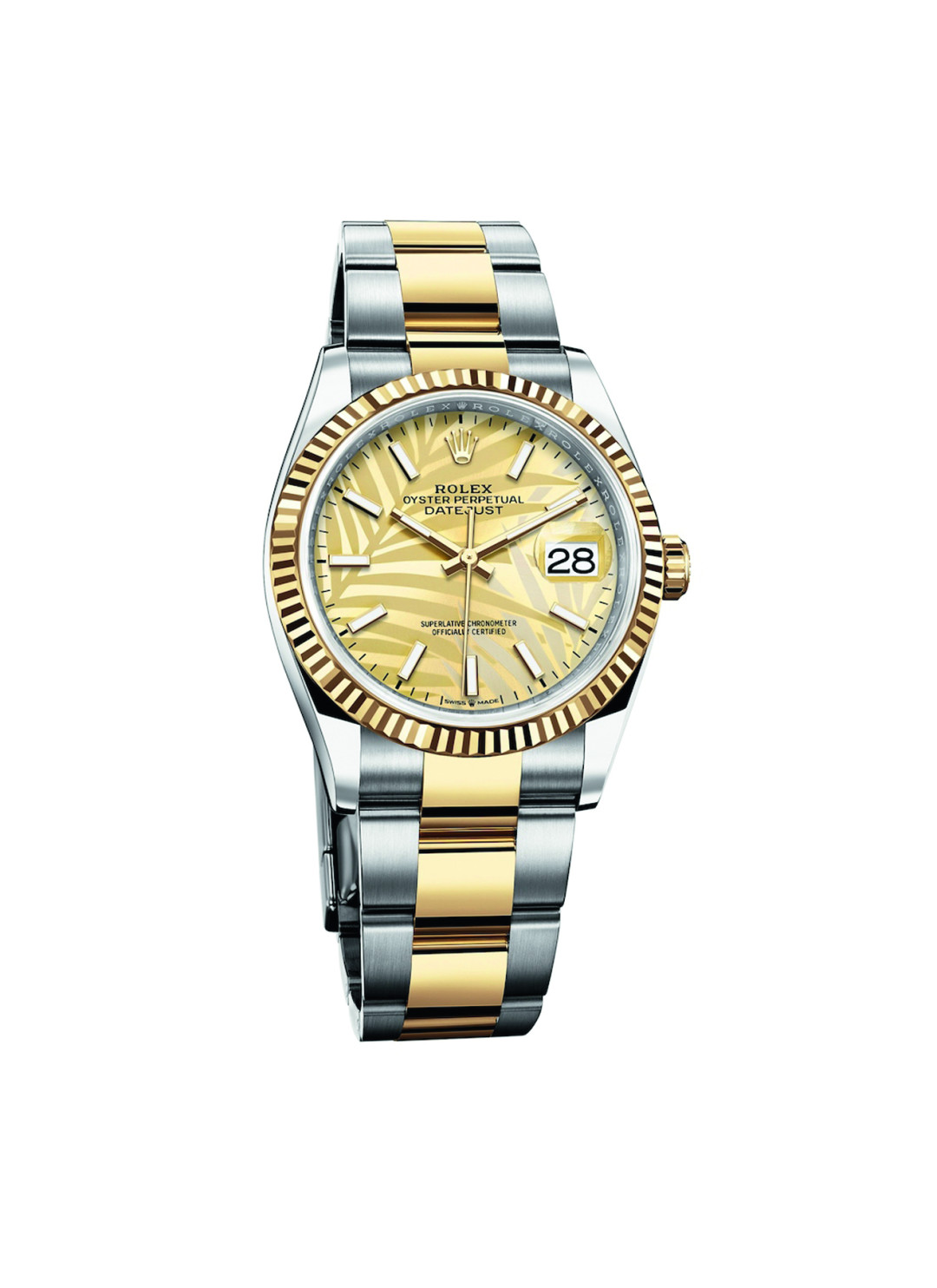 Golden hour навечно застрял в пальмовых листьях на циферблате новых часов с рифленым безелем и мануфактурным калибром 3235: от действия жары и магнитных полей его защищает анкерное колесо из фосфорно-никелевого сплава.
