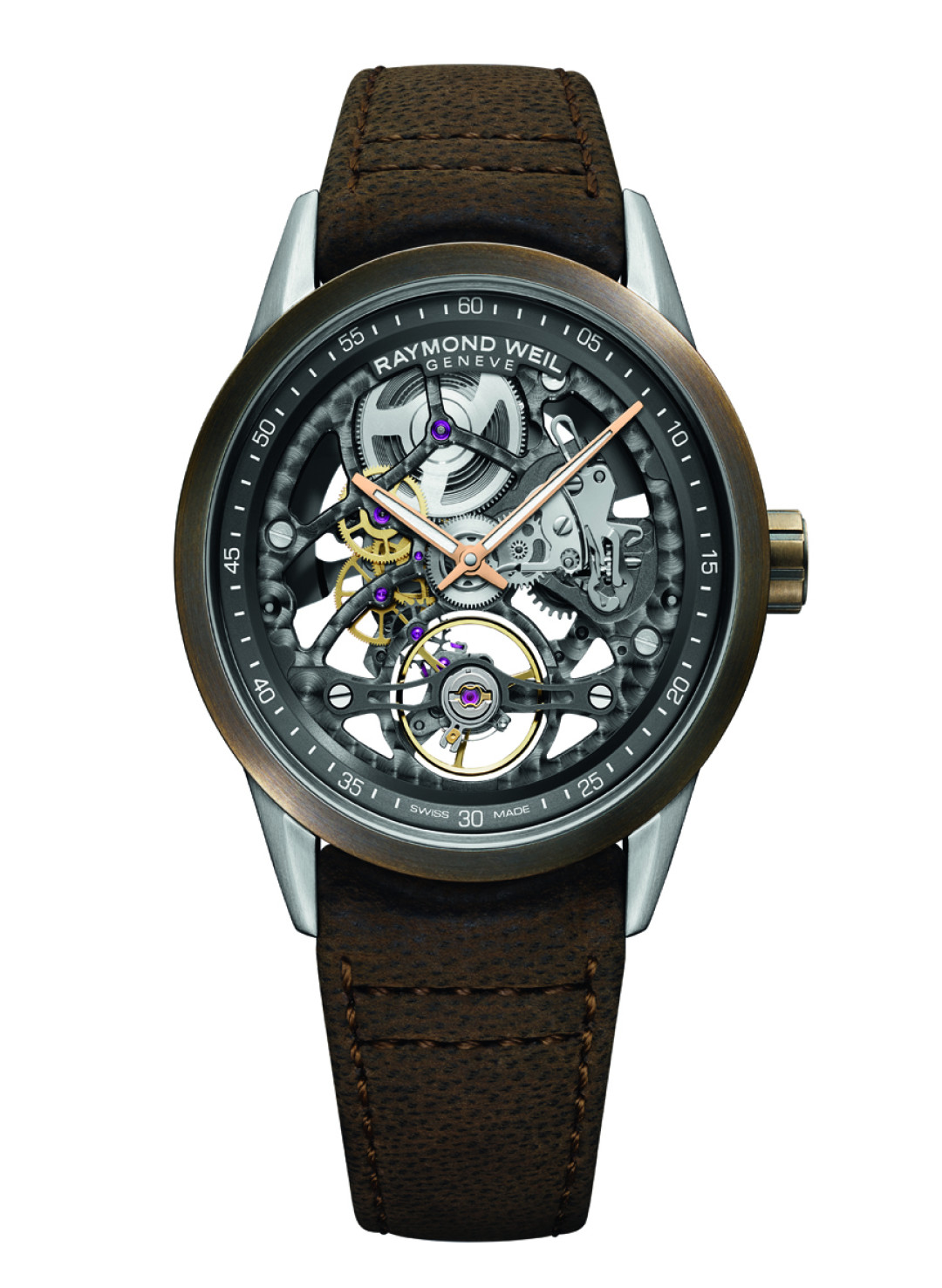 Скелетон в корпусе из нержавеющей стали с массивным бронзовым безелем посажен на ремешок из состаренной коричневой кожи.