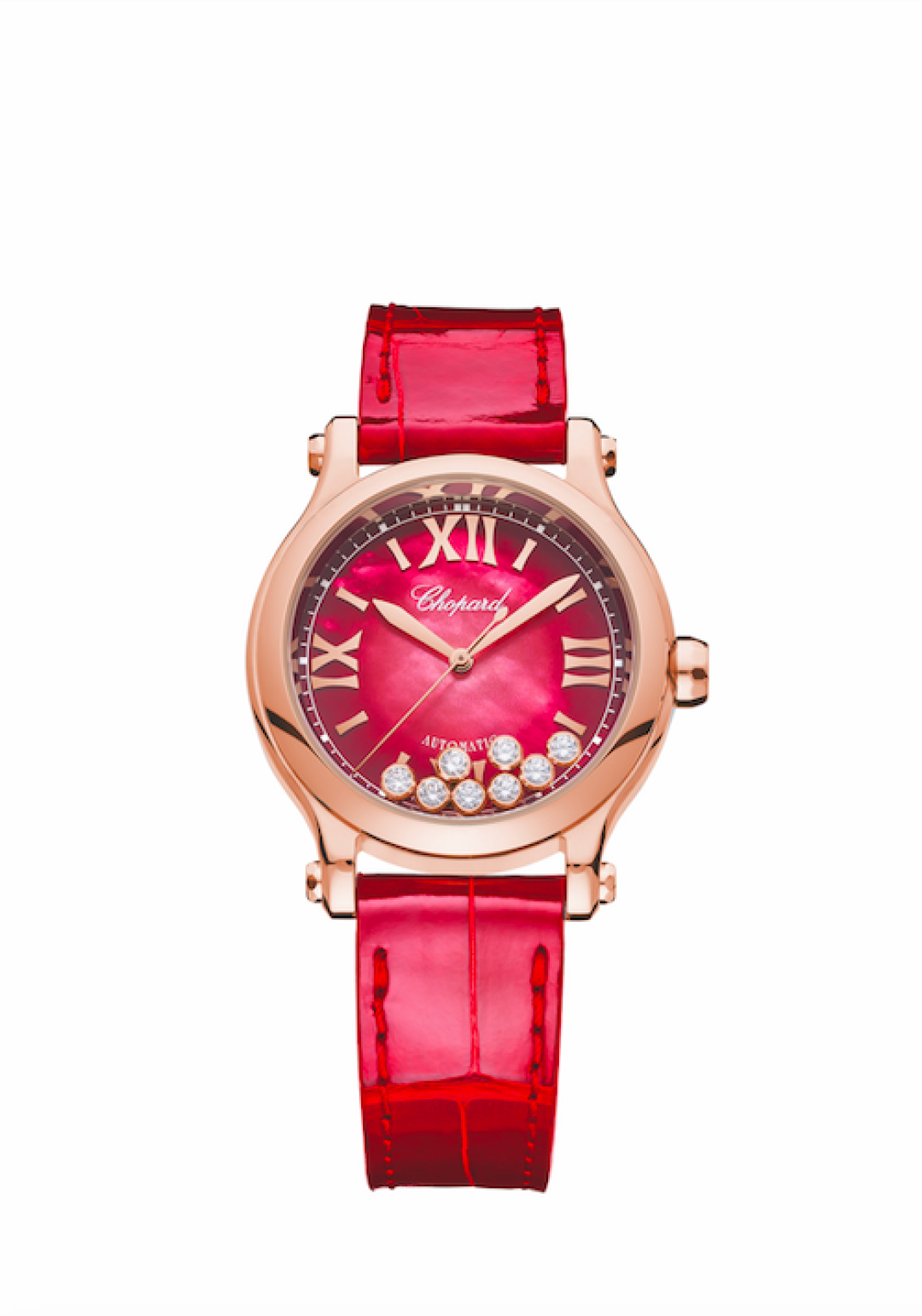 Восемь бриллиантов неистово кружатся по диску алого цвета. Держит их в рамках 33-миллиметровый корпус из розового золота.