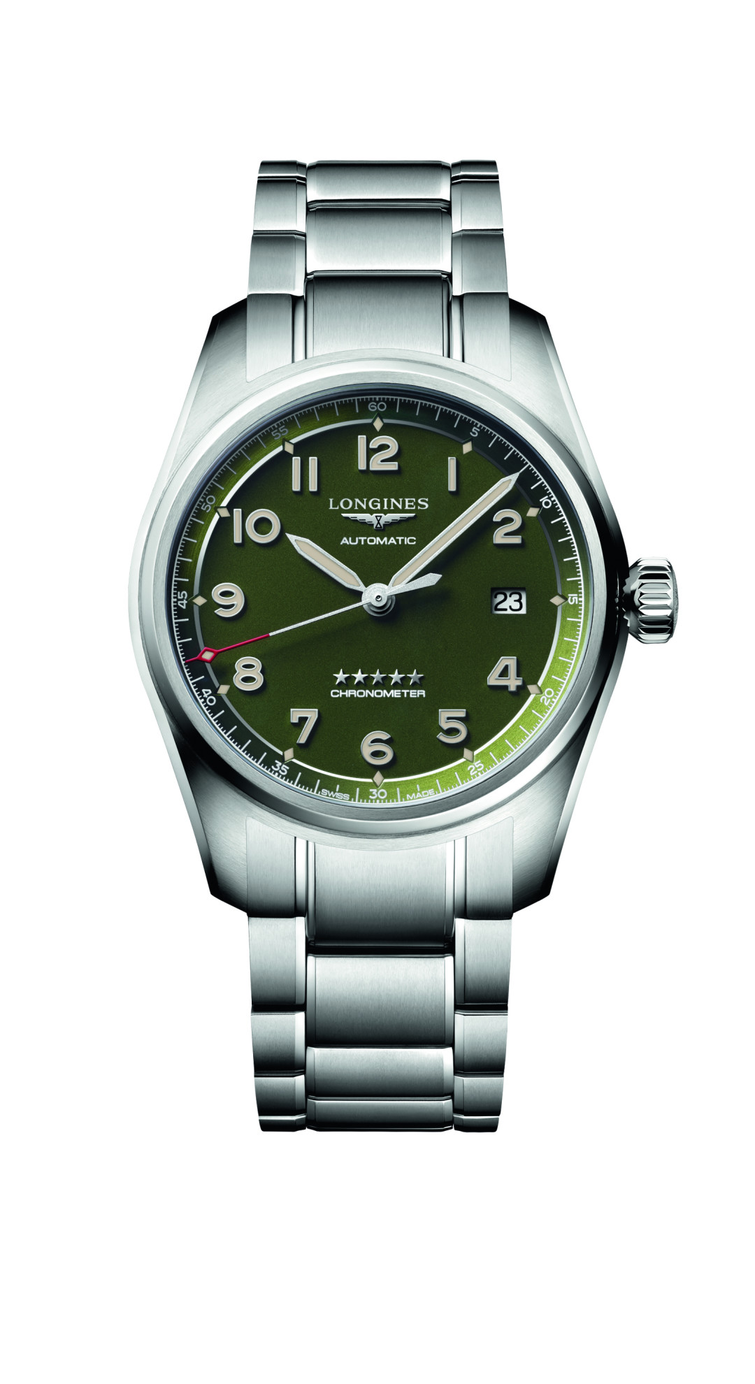 У хронографа Longines, с которым отважная Амелия Эрхарт дважды в одиночку пересекла Атлантику в 1928 и 1932 годах, был белый циферблат. По-родственному похожие на него часы коллекции Spirit до сих пор носили черный, серебристый или синий. Но новый зеленый циферблат с бежевым покрытием стрелок лучше всего вписался бы в винтажный лук первой авиаторки в ее летном костюме цвета хаки. Правда, со времен Амелии часы-пилоты заметно подросли: сегодняшние Longines Spirit Green вышли в корпусах 40 и 42 мм против скромных 35 вековой давности.