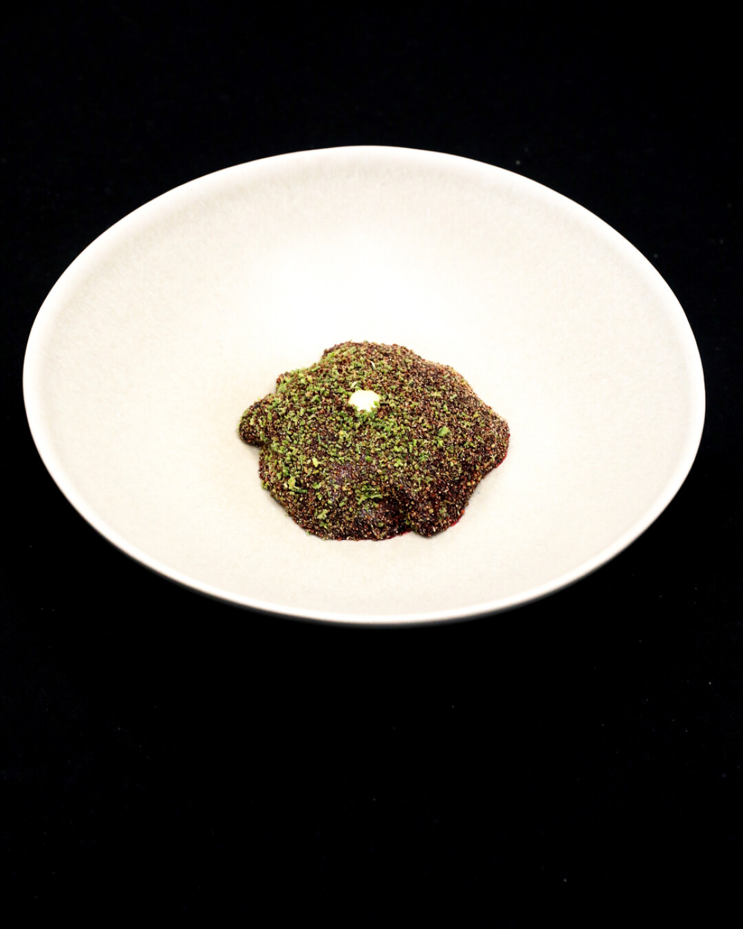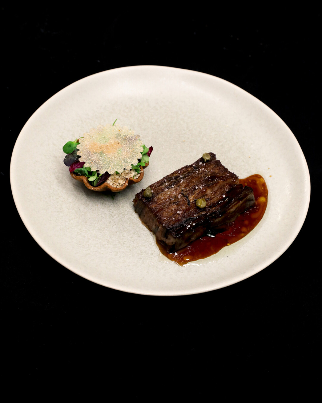 Фьюжн-меню включало свекольную закуску с еловыми почками и черной смородиной; основное блюдо — тающий во рту мильфей из говядины Вагю с шампиньонами и тарталеткой из сладкого картофеля, каштанов, ванили и черного чеснока. И на десерт — бисквит с морскими водорослями и шоколадом, украшенный сорбетом Юзу. Еще одним сюрпризом вечера стало выступление восходящей звезды французской сцены — Айме Симоне.