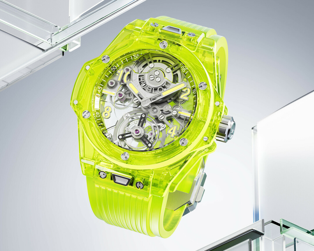 Hublot продолжает исследовать возможности SAXEM — материала, часто применяемого в спутниках и лазерных установках. Это позволяет мануфактуре получать невиданные ранее полупрозрачные цвета, среди которых теперь и фантастический неоновый желтый. Создание прозрачного корпуса в таком оттенке может показаться простым делом. Однако добиться этого было крайне сложно. Чтобы выполнить эту задачу, Hublot задействовал космические технологии — ведь композит SAXEM был разработан при создании спутников. Кроме того, было необходимо соблюсти строгие требования мануфактуры в отношении сапфировых часов, а именно – полная прозрачность и максимальная прочность. После выпуска модели MP-11 Emerald Green бренду понадобилось почти три года исследований, чтобы в очередной раз раздвинуть границы возможностей технологий и эстетики, и задача была реализована более чем на 100 процентов в модели Big Bang Tourbillon Automatic Yellow Neon SAXEM.