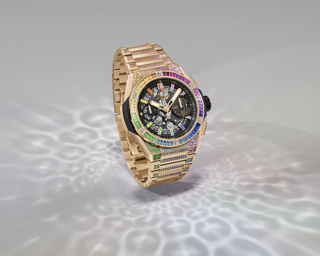 Теперь об отличиях. Каждая модель оснащена своим собственным механизмом. В Big Bang установлен автоматический калибр Unico – оригинальный скелетонизированный механизм производства мануфактуры Hublot, располагающий трехдневным запасом хода. «Механическое сердце» бьется в корпусе диаметром 42 мм. Вторая модель, Time Only, имеет корпус диаметром 40 мм — такой диаметр впервые применяется в часах Big Bang с момента их презентации в 2022 году. Результат — еще более компактный и оригинальный вид. Механизм, управляющий трехстрелочной индикацией и указателем даты, идеально подходит для данного корпуса и полностью его заполняет. Обе «радужные» новинки представляет собой превосходную комбинацию технологичности часового мастерства и изящества ювелирного искусства.