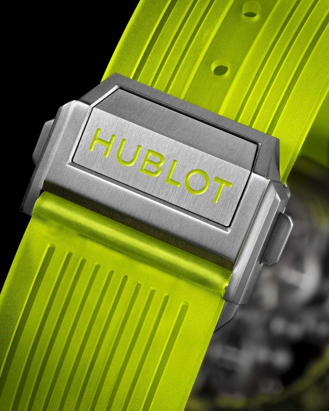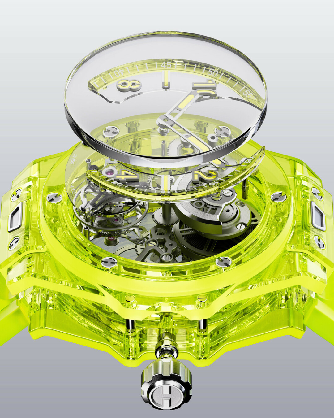 Исследования возможностей SAXEM позоляют Hublot добиваться невиданных ранее полупрозрачных цветов, среди которых теперь и фантастический неоновый желтый. Создание прозрачного корпуса в таком оттенке может показаться простым делом. Однако добиться этого было крайне сложно. Чтобы выполнить эту задачу, Hublot задействовали космические технологии — ведь композит SAXEM был разработан при создании спутников. Этот уникальный материал также использовался в 2019 году в модели Big Bang MP-11 — тогда был выбран изумрудно-зеленый оттенок.