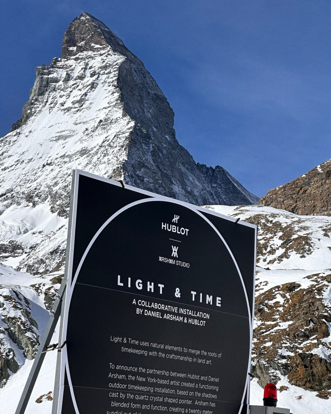 Художник создал солнечные часы диаметром 20 метров, высеченные в снежном ландшафте горнолыжного курорта Церматт в Швейцарии на высоте 2583 метров. Это первое сотрудничество Дэниэля Аршама с часовым брендом и его нельзя купить, но можно рассмотреть с подъемника в тени Маттерхорна, самой узнаваемой вершины швейцарских Альп. Эфемерная инсталляция под названием «Свет и время» использует природные элементы, чтобы объединить хронометрию с мастерством ленд-арта.