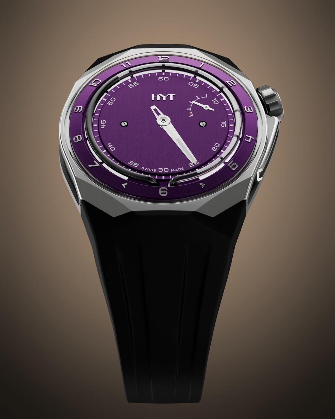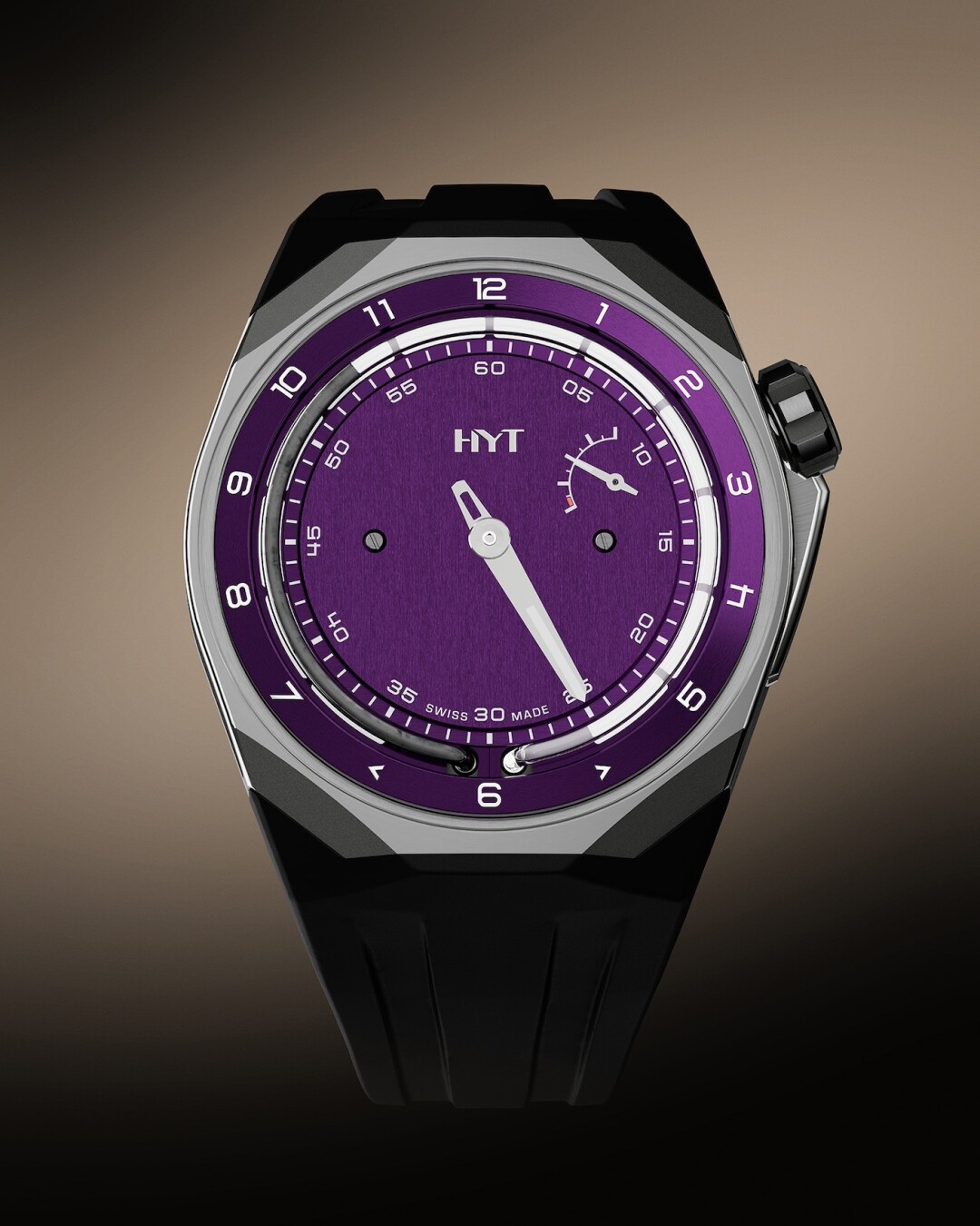 На этот раз HYT представила более эргономичную модель с диаметром корпуса 45 мм, что делает ее более удобной в повседневной носке. В комплекте идут два ремешка: классический черный из каучука и фиолетовый, который гармонично сочетается с цветом циферблата. Оба ремешка идеально интегрированы с корпусом, обеспечивая комфортное прилегание часов к запястью.