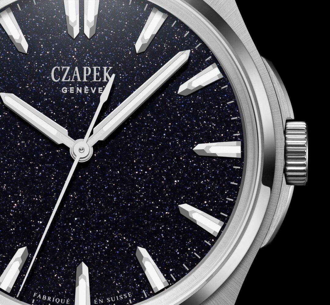 Циферблат из авантюрина стал настоящей визитной карточкой бренда Czapek. Этот мерцающий, почти космический материал уже использовался в коллекциях Quai de Bergues и Faubourg de Cracovie, но в новой модели Antarctique он раскрывается с особенной глубиной. Создатели часов считают, что богатый и загадочный оттенок авантюрина подчеркивает дух коллекции, ведь Антарктида — одно из лучших мест на Земле для наблюдения за звездами.