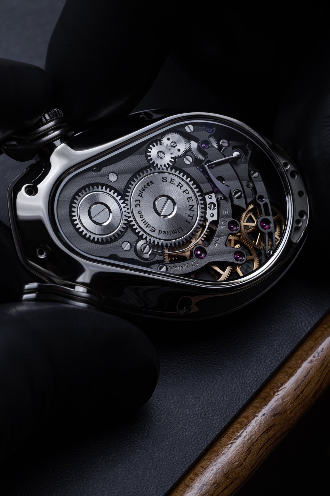Новинка потребовала оригинальной разработки с точки зрения инженерии, концепции механизма и дизайна. Изгибы выходят за пределы корпуса и заходят на пять сапфировых стекол, включая глаза змеи и многогранную заднюю часть. Для достижения идеальной бесшовной формы, обладающей водонепроницаемостью до 30 метров, потребовались сотни эскизов, а на 3D-принтере были напечатаны десятки моделей. Маленький корпус ювелирных часов трансформировался в крупную головку, в которую удалось разместить механизм MB&F с характерным подвесным балансом, впервые представленным на модели Legacy Machine 1. Внутри сложного корпуса столь же сложный механизм с запасом хода 45 часов, содержащий 310 компонентов. Все детали обработаны вручную. Механизм часов был разработан и создан внутри компании MB&F. Он включает вращающиеся купола для отображения часов и минут: левый купол совершает полный оборот за 12 часов, а правый — за 60 минут.