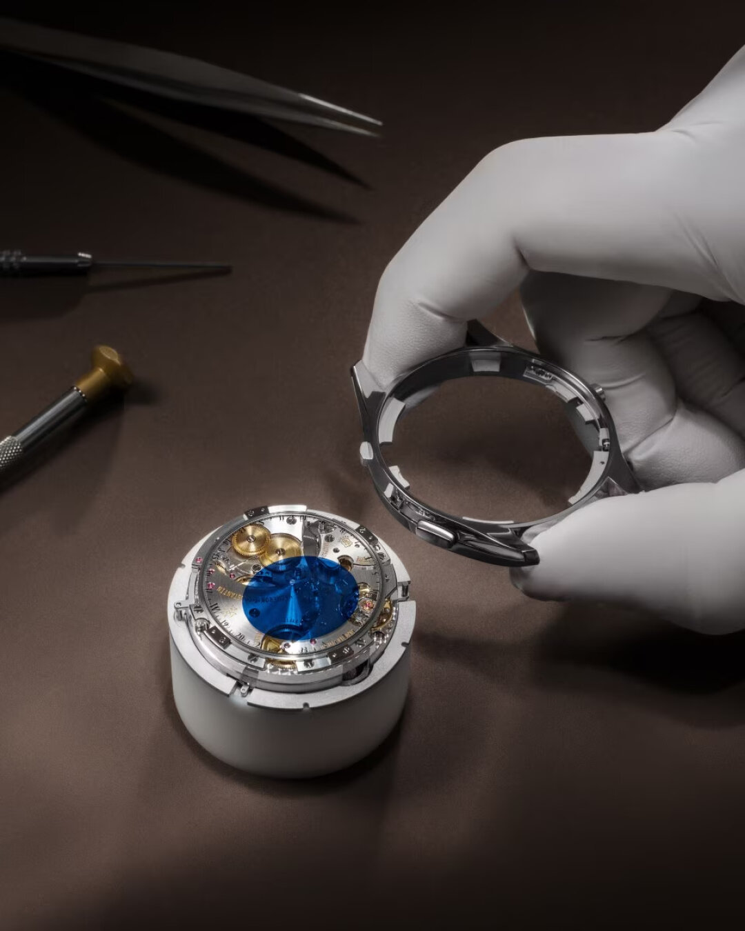 Внутри — новый механизм калибра 3670, над которым мастера трудились три года. В нем 512 деталей, частота — 36 000 колебаний в час.