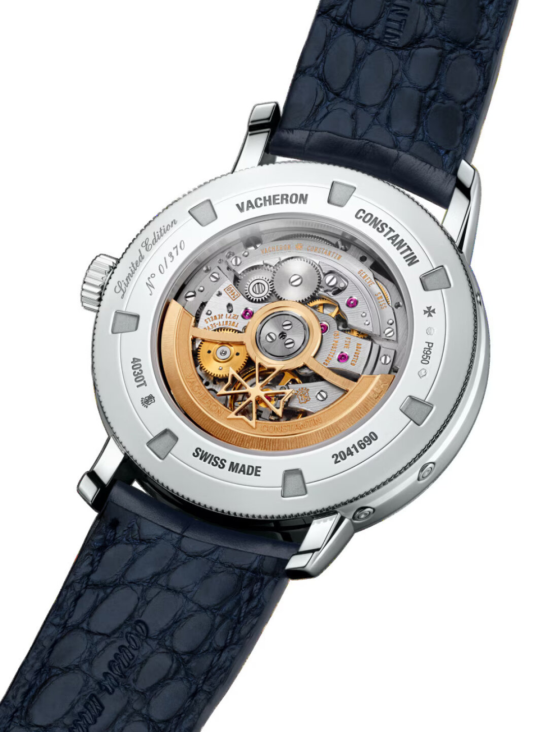 Стрелки и метки — из золота 18 карат, ремешок — темно-синий, из кожи аллигатора. Диаметр — 41 мм, водонепроницаемость — 30 м. Выпуск ограничен 370 экземплярами.