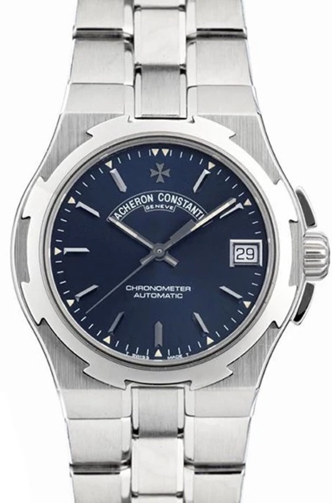 Часы выглядят как единое целое с интегрированным браслетом. Сатинированные и полированные поверхности создают эффект живого света. Особого внимания заслуживает задняя крышка с гравировкой корабля на волнах и надписью Overseas курсивом.