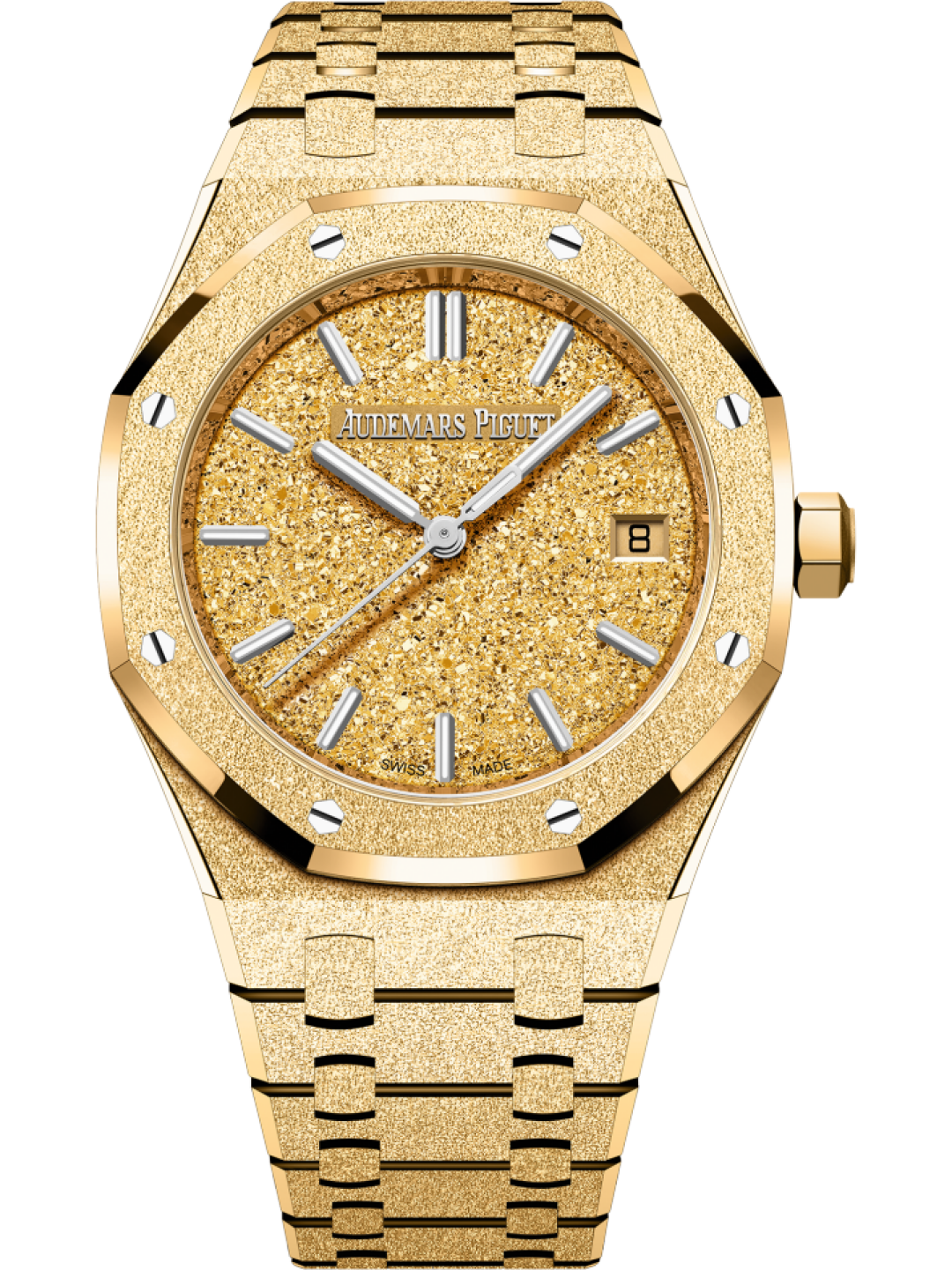 Представьте золото, которое не просто блестит, а словно оживает на свету. Так выглядят Royal Oak Frosted Gold. Их корпус обработан с помощью старинной флорентийской техники Frosted Gold: каждая микроскопическая грань ловит свет, создавая эффект инея или россыпи алмазной пыли. При движении часы буквально оживают, и 34-миллиметровый корпус из желтого золота мерцает ярче любых камней.
