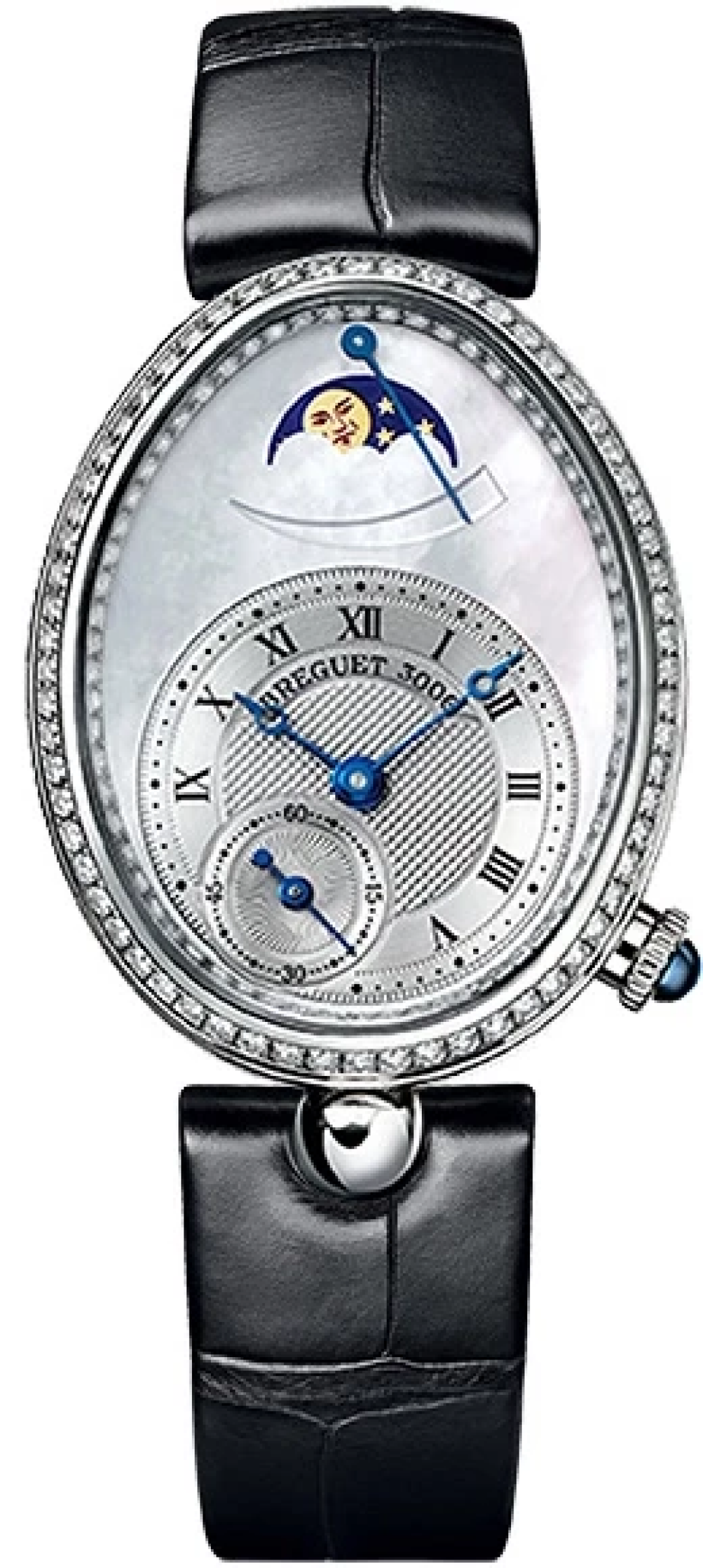 Reine de Naples — одна из немногих моделей, которая имеет право на слово «королевские» без всяких допущений. Именно с часов для королевы Неаполя Каролины Мюрат в 1812 году началась история наручных часов как таковых, а линия Reine de Naples до сих пор остается самой женственной и аристократичной у бренда. Овальный корпус из белого золота размером 28,45 × 36,5 мм, обрамленный бриллиантами, выглядит не декоративно, а по-настоящему статусно, как ювелирный предмет с историей власти и вкуса.
