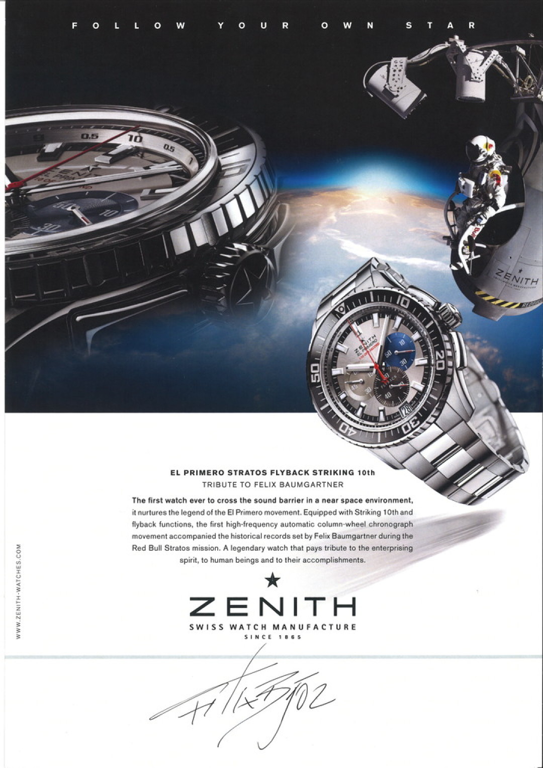 5. В 2012 году Zenith вошел в историю вместе с Феликсом Баумгартнером, который 14 октября стал первым человеком, преодолевшим скорость звука и совершившим затяжной прыжок из стратосферы с высоты 38 969,4 метра с успешным приземлением в пустыне штата Нью-Мексико. Бренд Zenith стал официальным хронометристом этого события, а сам Баумгартнер выбрал для прыжка часы Zenith Stratos Flyback Striking 10th со знаменитым механизмом El Primero.