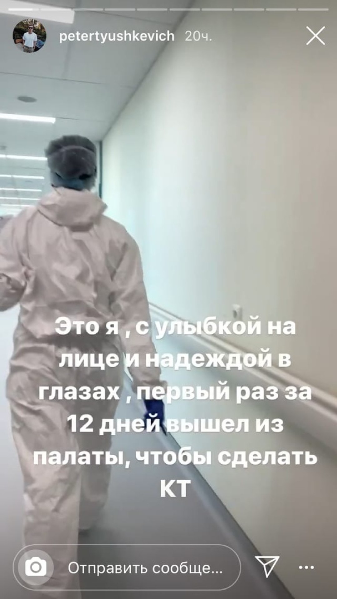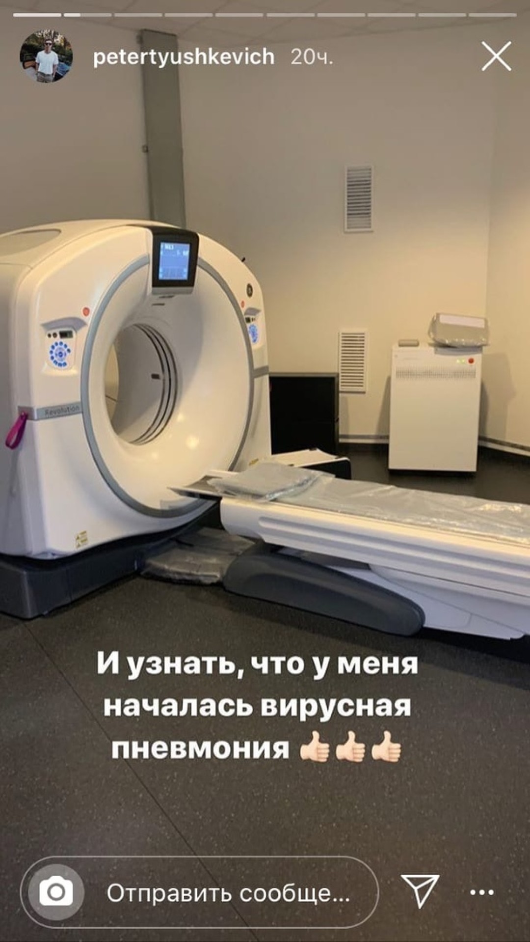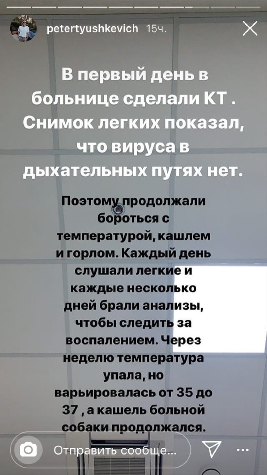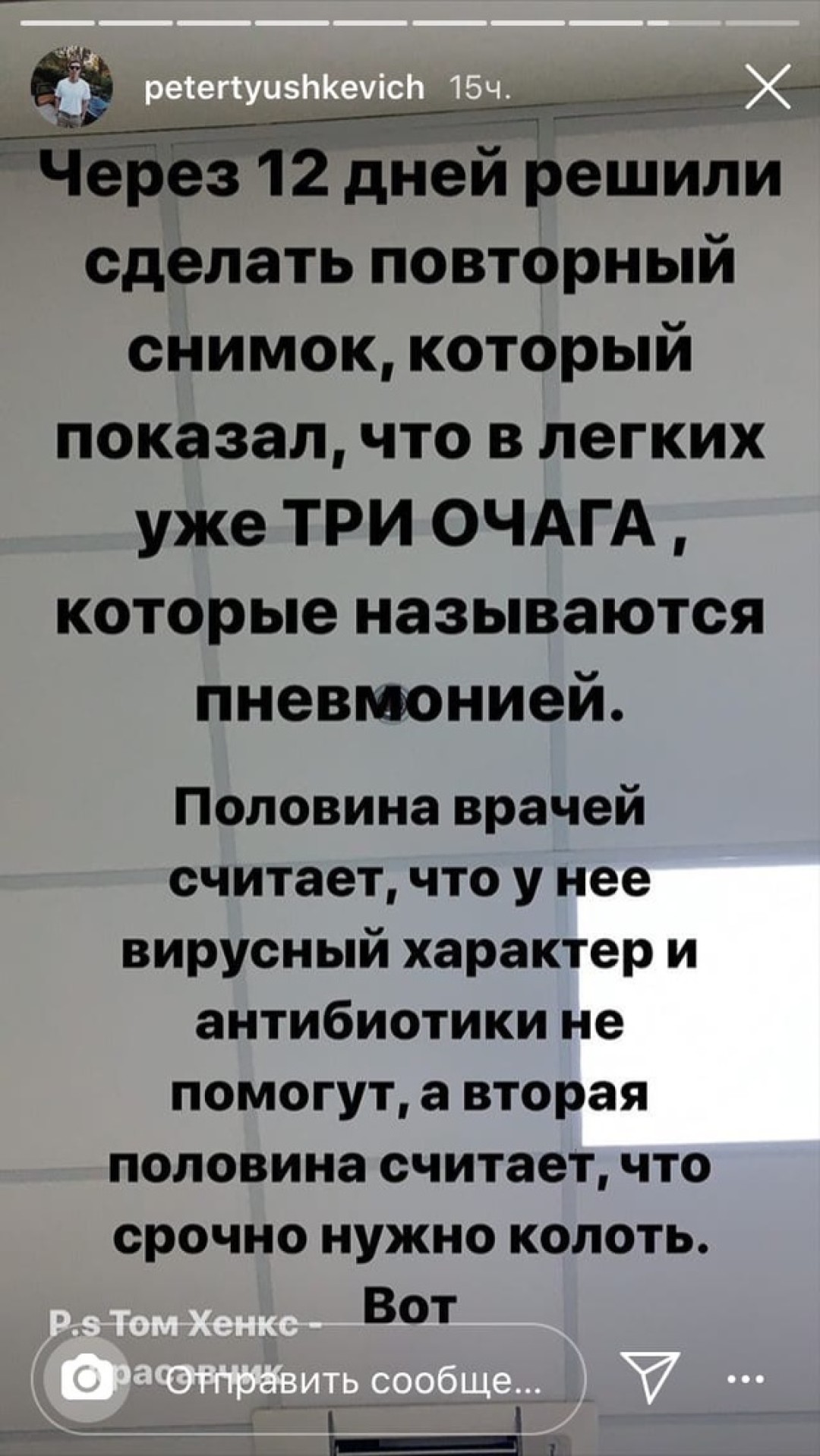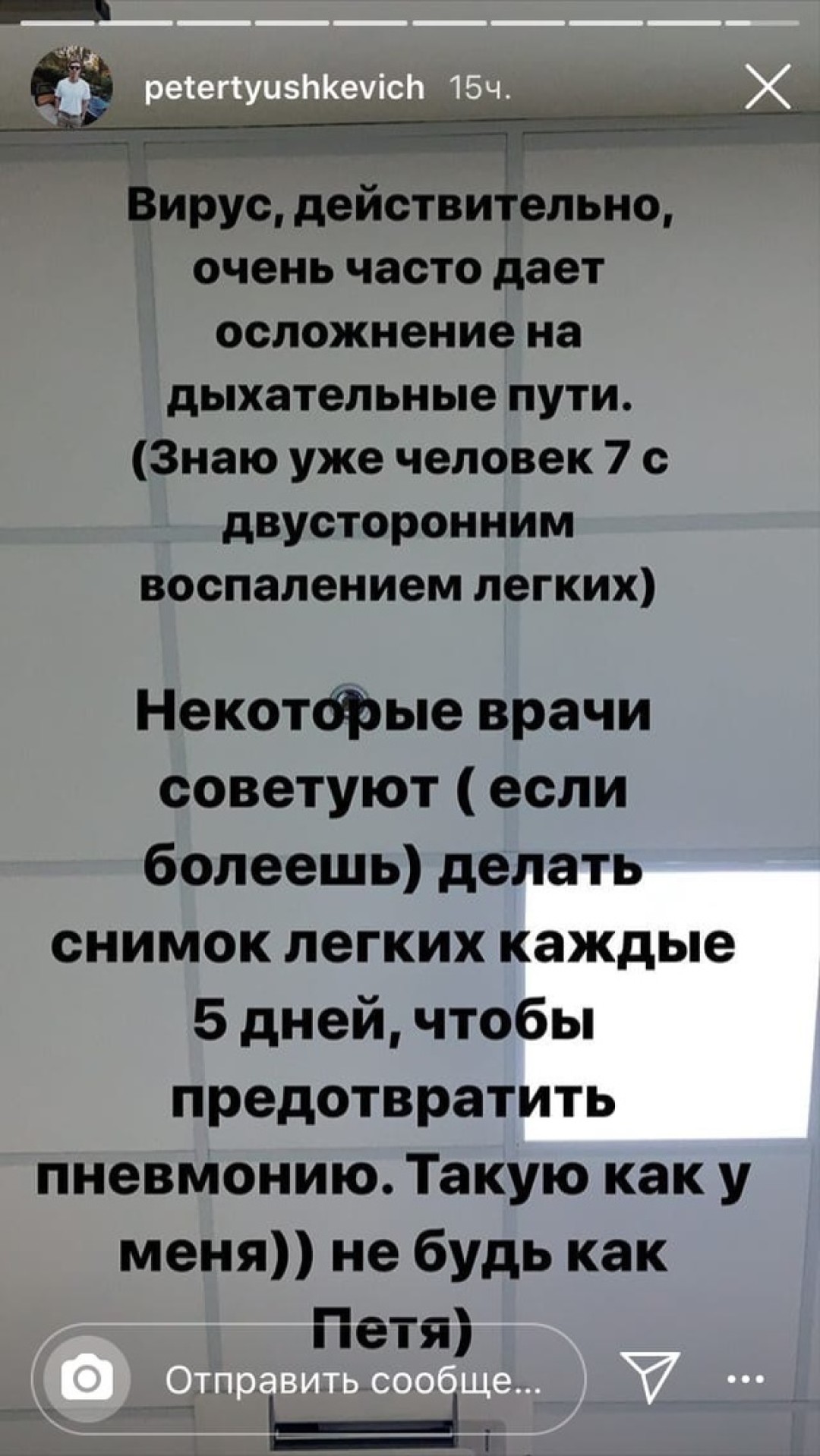 «Через 12 дней решили сделать повторный снимок, который показал, что в легких уже три очага, которые называются пневмонией. Половина врачей считает, что у нее вирусный характер, и антибиотики не помогут, а вторая половина считает, что срочно нужно колоть. Вирус, действительно, очень часто дает осложнение на дыхательные пути — знаю уже человек 7 с двусторонним воспалением легких. Некоторые врачи советуют делать снимок легких каждых 5 дней, чтобы предотвратить пневмонию. Такую как у меня. Не будь как Петя!» — поделился Тюшкевич.