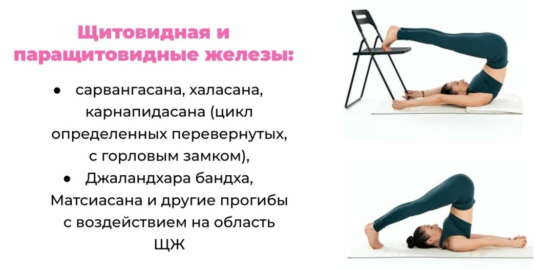 Сарвангасана, Халасана, Карнапидасана — цикл перевёрнутых асан с горловым замком Джаландхарой Бандхой. «Поза рыбы» Матсиасана и другие прогибы, которые активно воздействуют именно на область щитовидной железы.