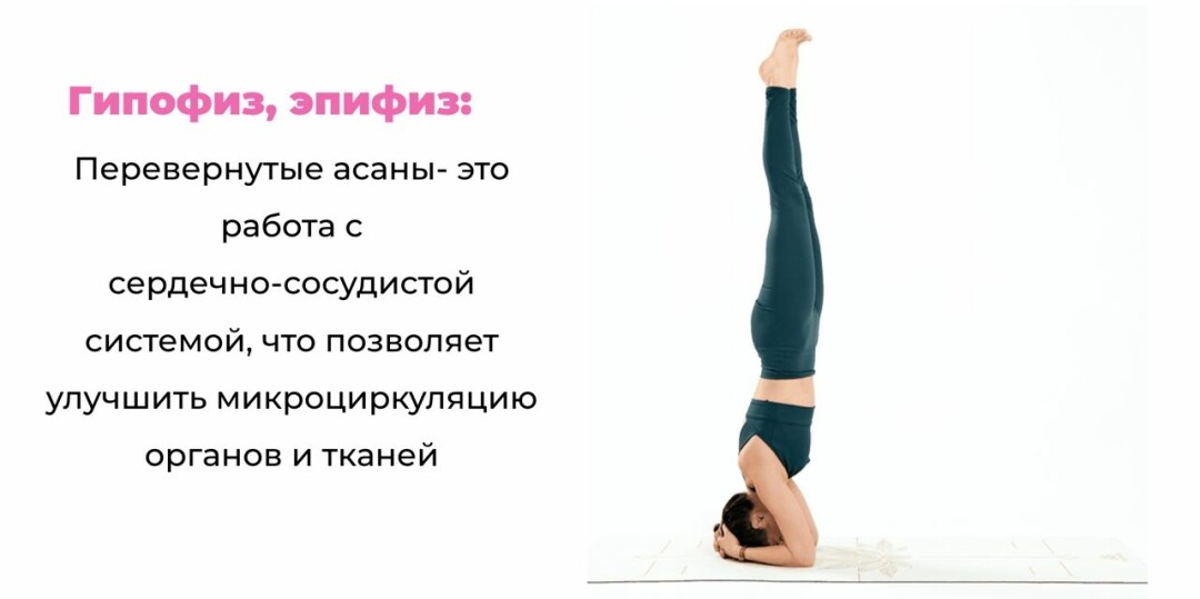 Здесь подойдут перевёрнутые асаны. Дополнительный артериальный приток даёт свой эффект в отношении желез внутренней секреции на уровне головного мозга. Перевернутые асаны также работают с сердечно-сосудистой системой и организуют тот самый венозный возврат, который необходим для здоровья буквально всех органов и тканей.
