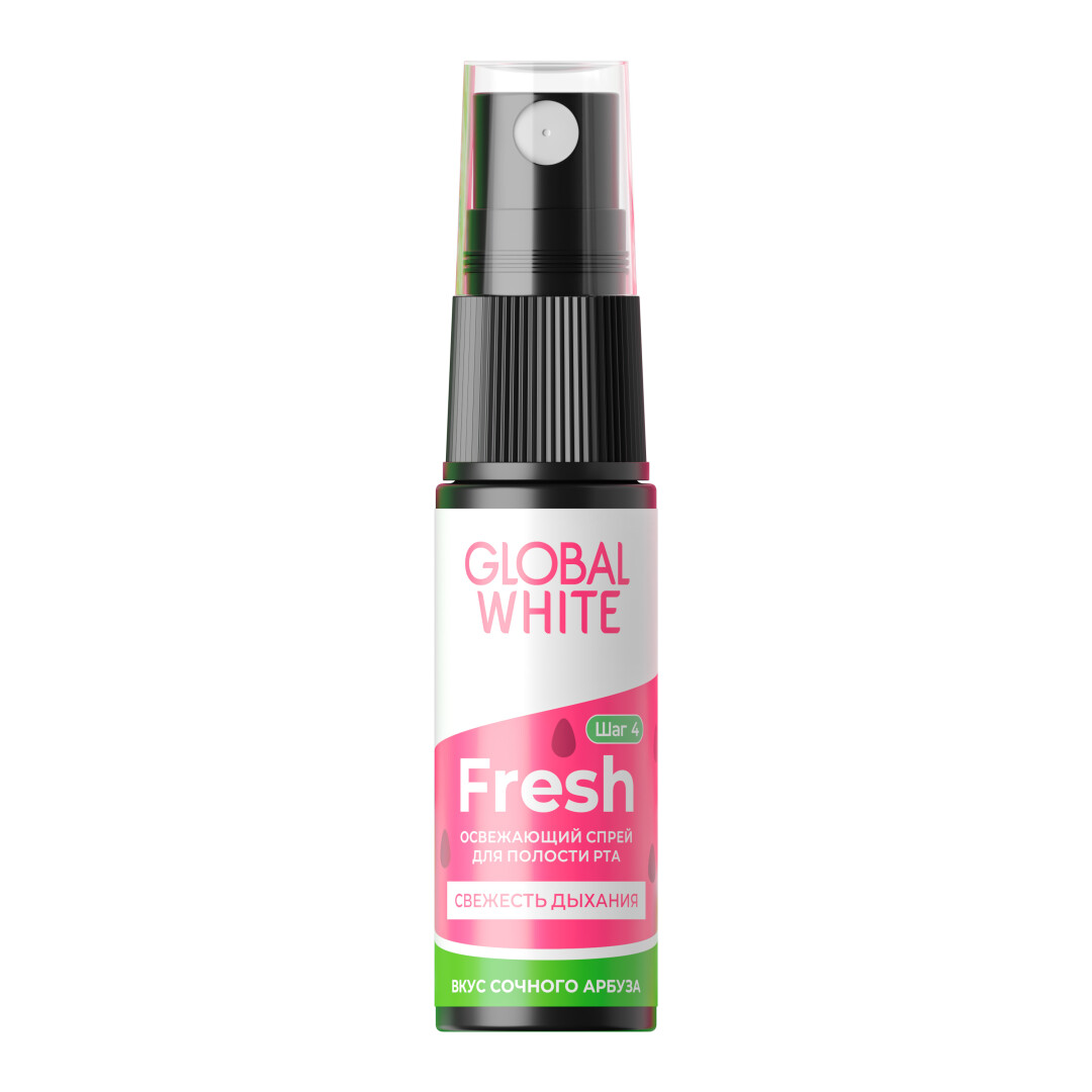 Освежающий спрей GLOBAL WHITE FRESH со вкусом арбуза содержит натуральные экстракты оливы и петрушки, ксилитол.