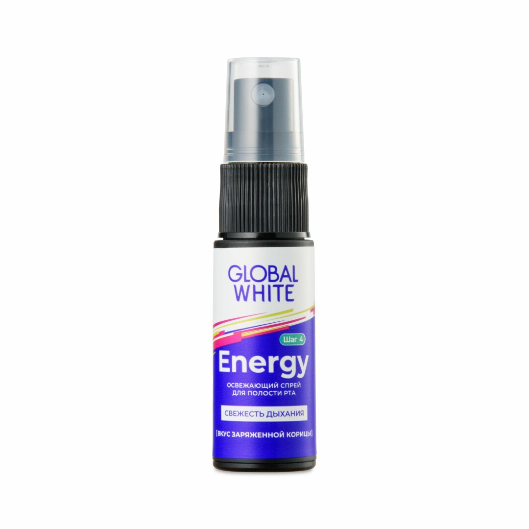 Освежающий спрей GLOBAL WHITE ENERGY со вкусом корицы оказывает тонизирующее действие на десны (в нем есть экстракт гуараны) и обладает антиоксидантными свойствами (спасибо кофеину).