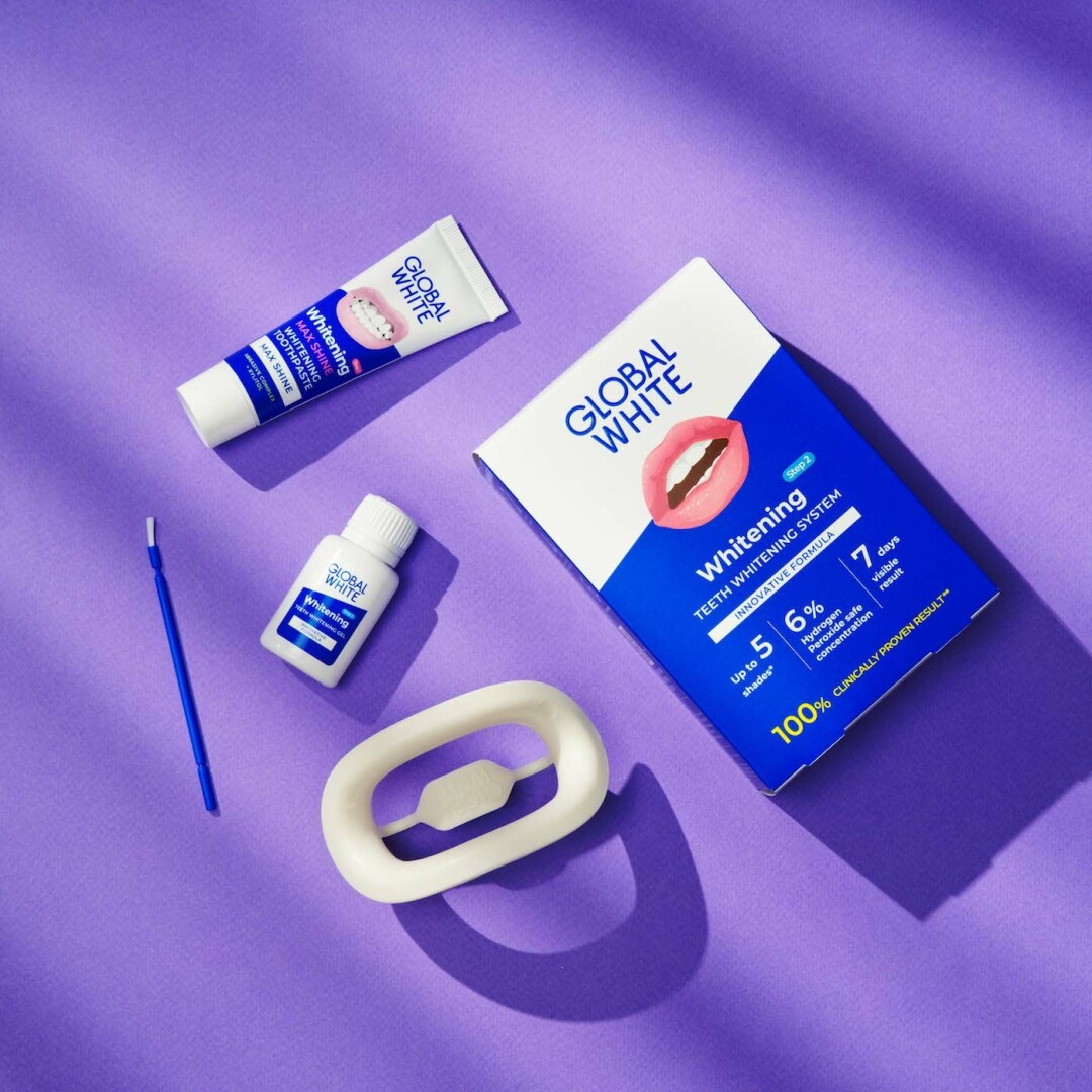 Главный этап — нанесение геля с активным кислородом, который проникает в дентин и расщепляет красящий пигмент изнутри. Процедура безопасна и безболезненна благодаря щадящей концентрации пероксида водорода — всего 6% (для сравнения: в стоматологических клиниках используют дозировку 40%). Ассортимент GLOBAL WHITE позволяет выбрать удобный формат: плотно прилегающие к зубам отбеливающие полоски, гель-карандаш или комплексную отбеливающую систему, в которую входит паста, гель, ретрактор и микрощеточка для более легкого нанесения.