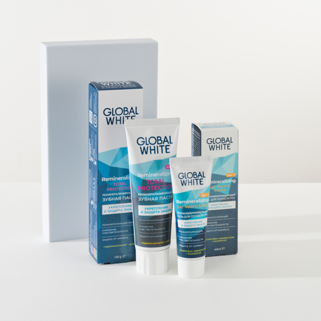 Наличие этих двух шагов после отбеливания — доказательство профессионального подхода. Отсутствие этих этапов зачастую и приводит к часто встречающейся побочке — повышенной чувствительности эмали. Чтобы избежать этого, в системе GLOBAL WHITE на третьем этапе предусмотрен гель с экстрактом ламинарии, комплексом минералов и фтором, который восстанавливает минеральный баланс зуба, предотвращая развитие чувствительности.