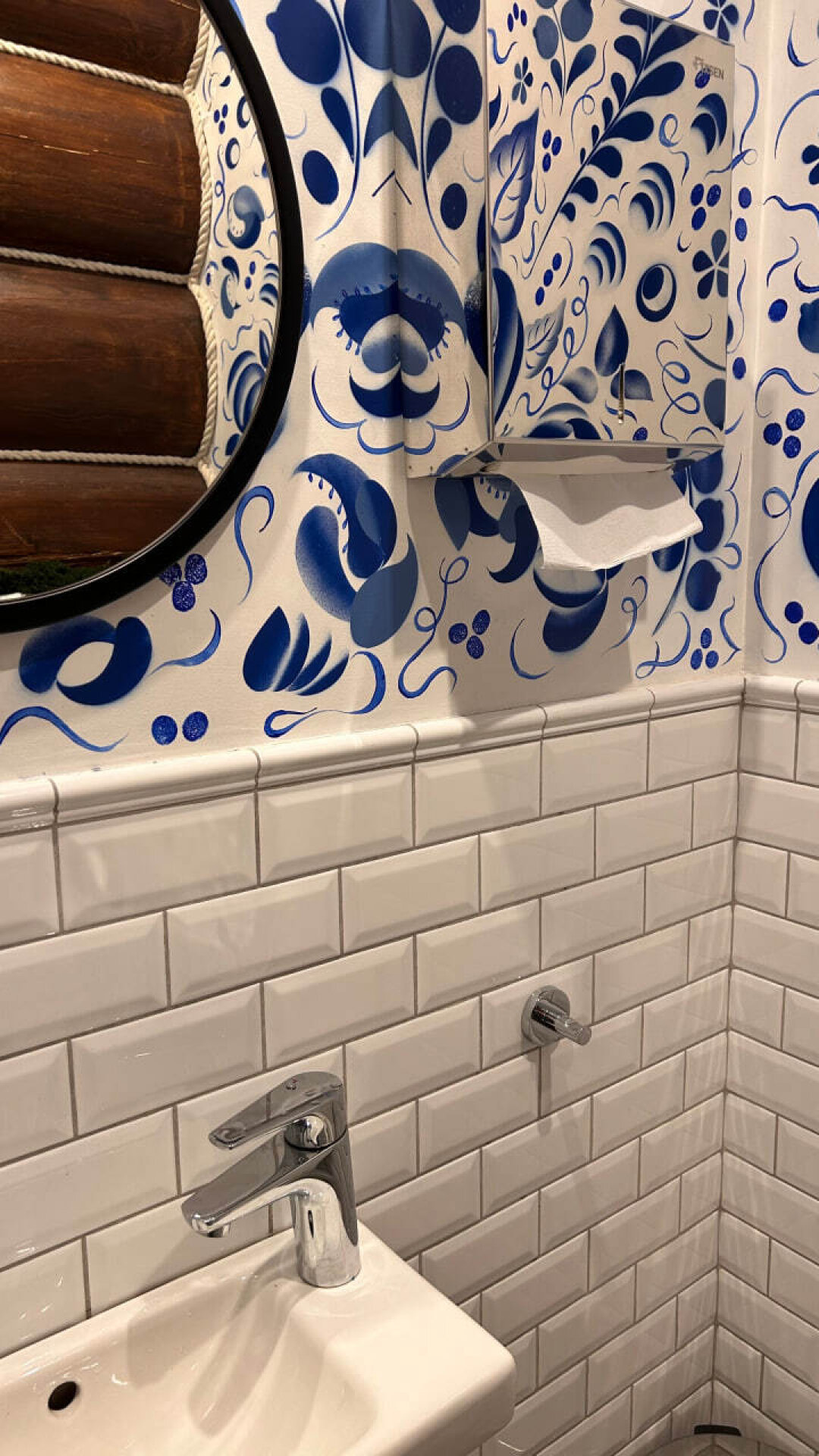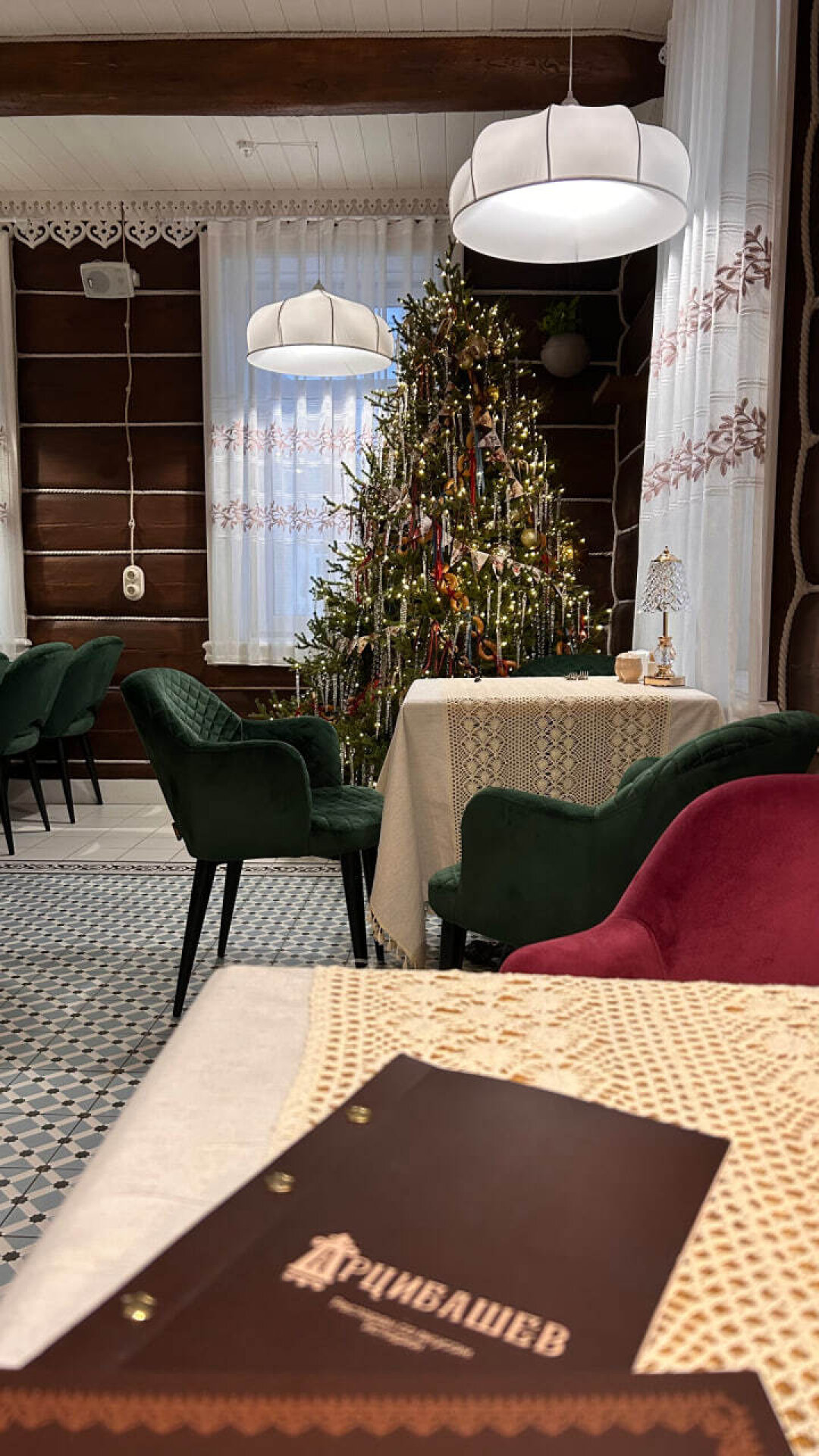 Музыка здесь меня напрягла сначала: что-то на кадышевском (не люблю, хоть и вызывает умиление ее новая волна популярности). К счастью, скоро песни сменили мягкие и мелодичные треки в направлении фолк. Вообще здесь уютно. Красивую елку нарядили, стены украшают портреты красивых барышень, столы нарядили кружевными салфетками, туалет раскрасили в гжель.