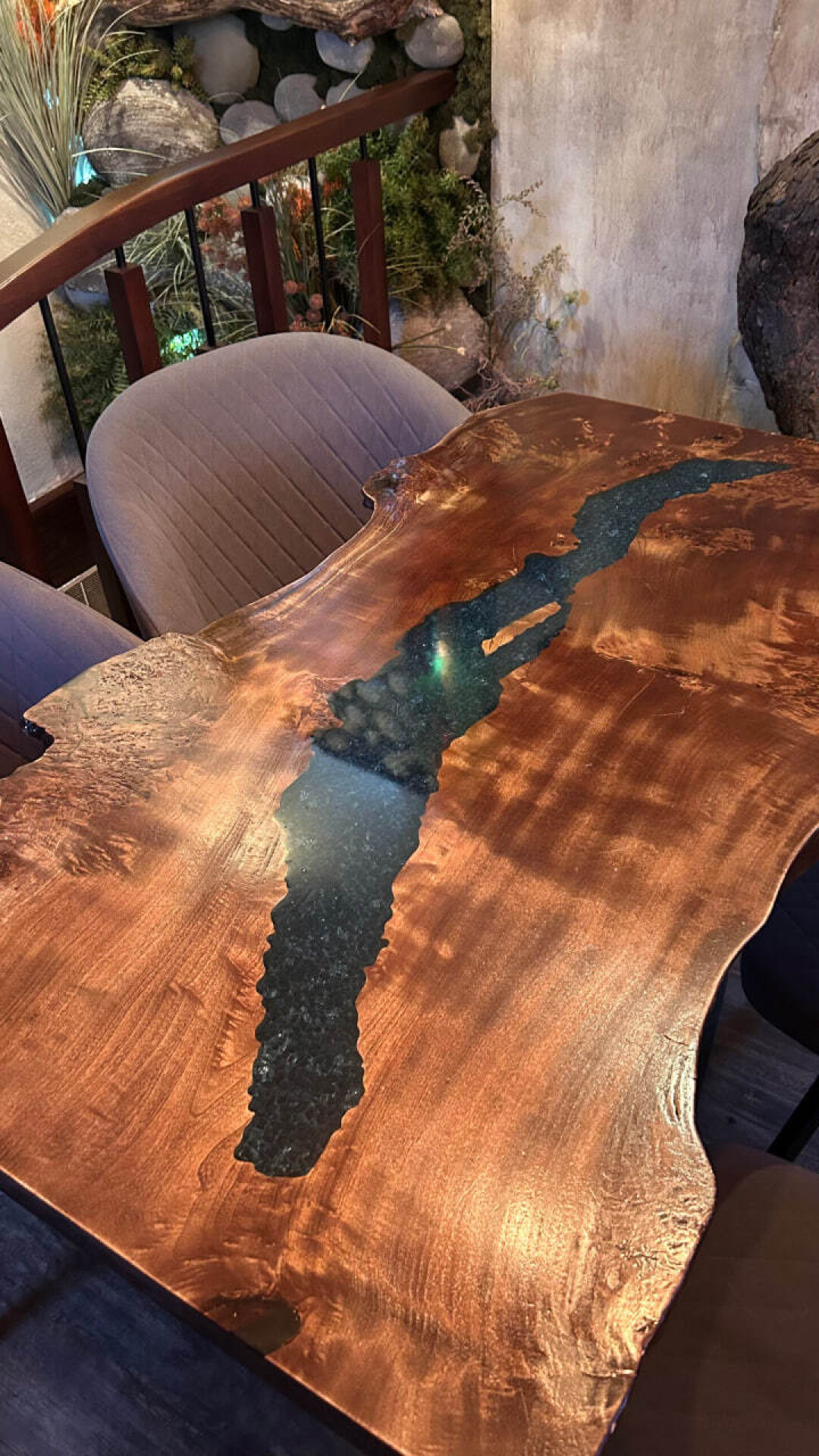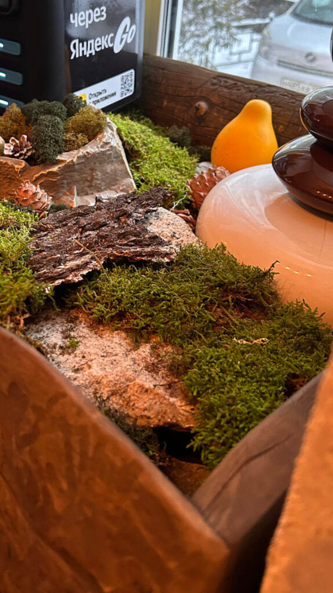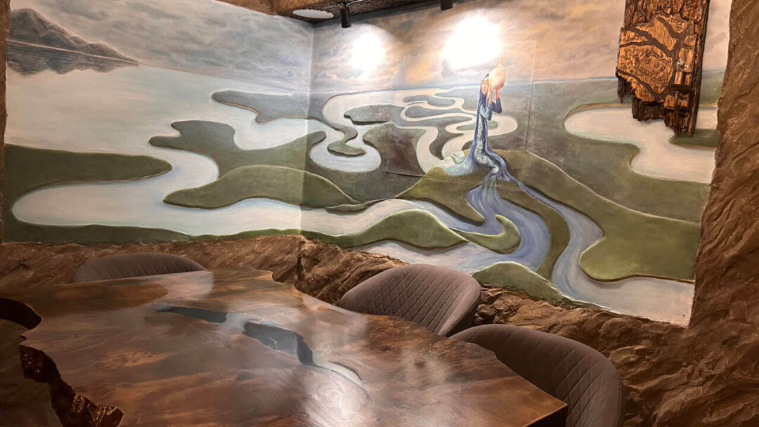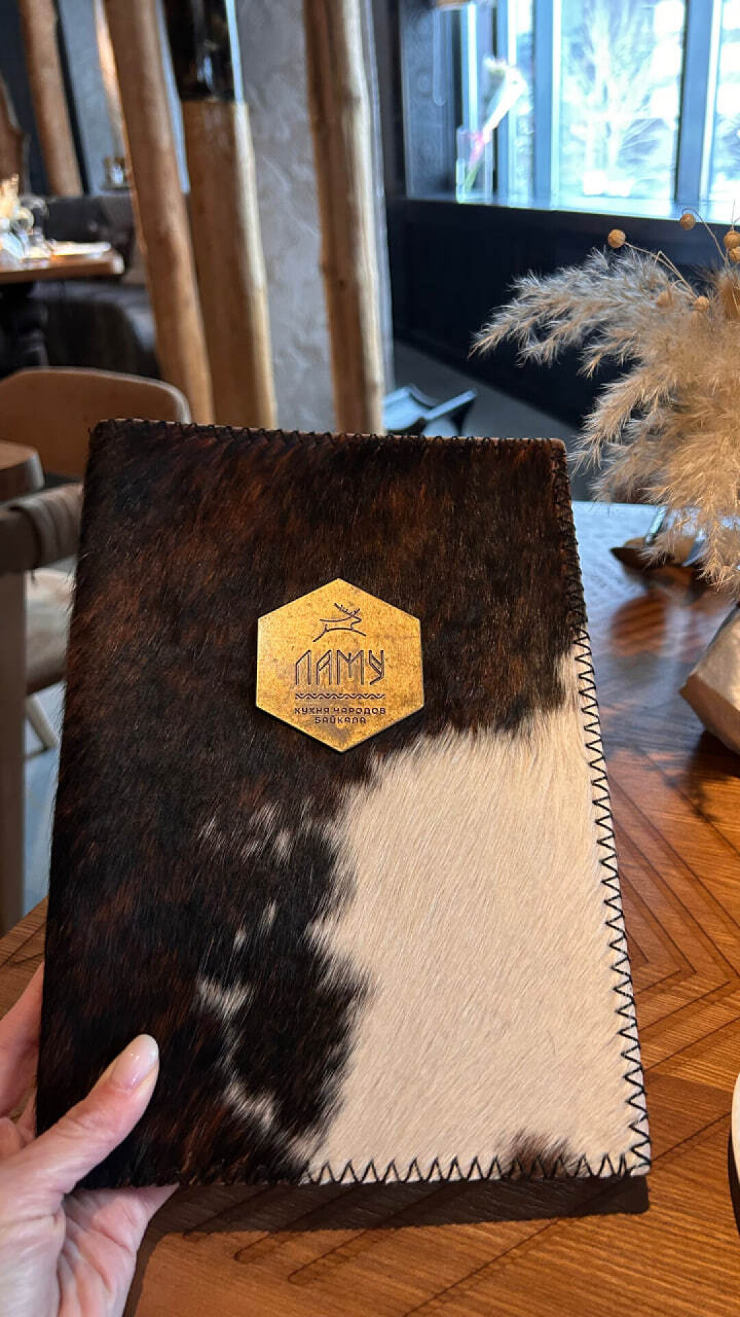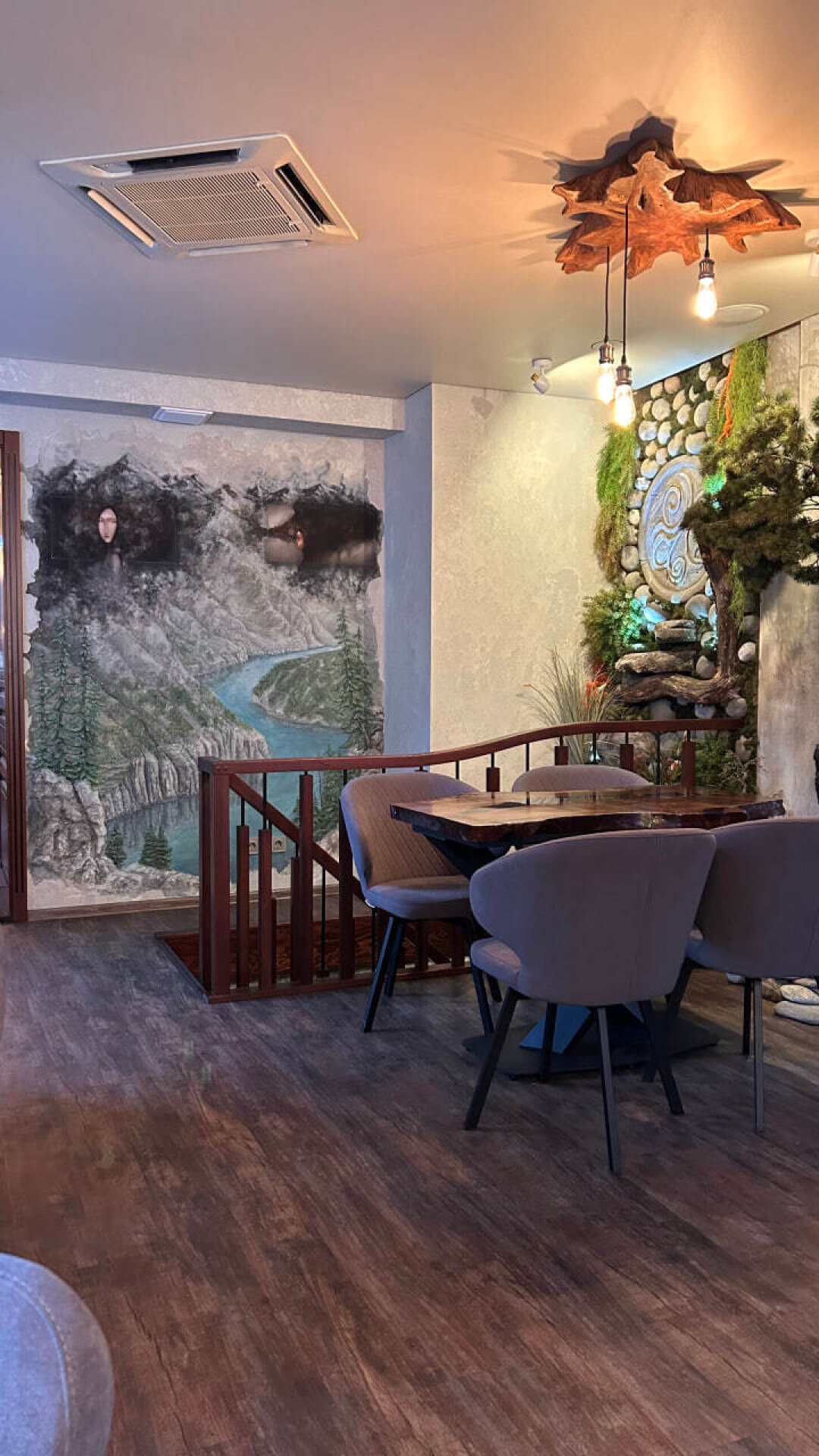 Администратор Андрей провел мне экскурсию по ресторану (приятно!). Владельцы прямо заморочились с деталями. Светильники, подставки для цветов и другие предметы декора выполнены из мха, древесной коры и досок. Картины сестер Ертахановых дополнили (и продолжили!) барельефом на стенах, красиво вписав их в интерьер. Обязательно обратите внимание на столы: вставки из слюды в виде сибирских рек и озера Байкал впечатляют! А чашки ручной работы не хочется выпускать из рук. Молодцы.