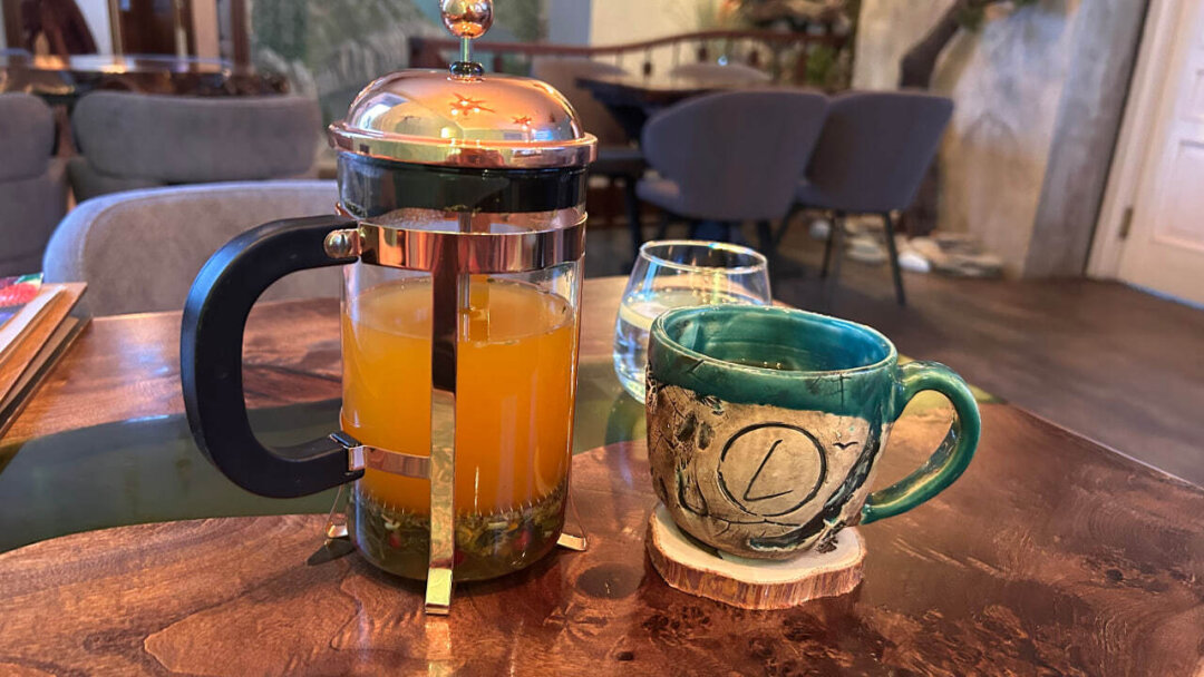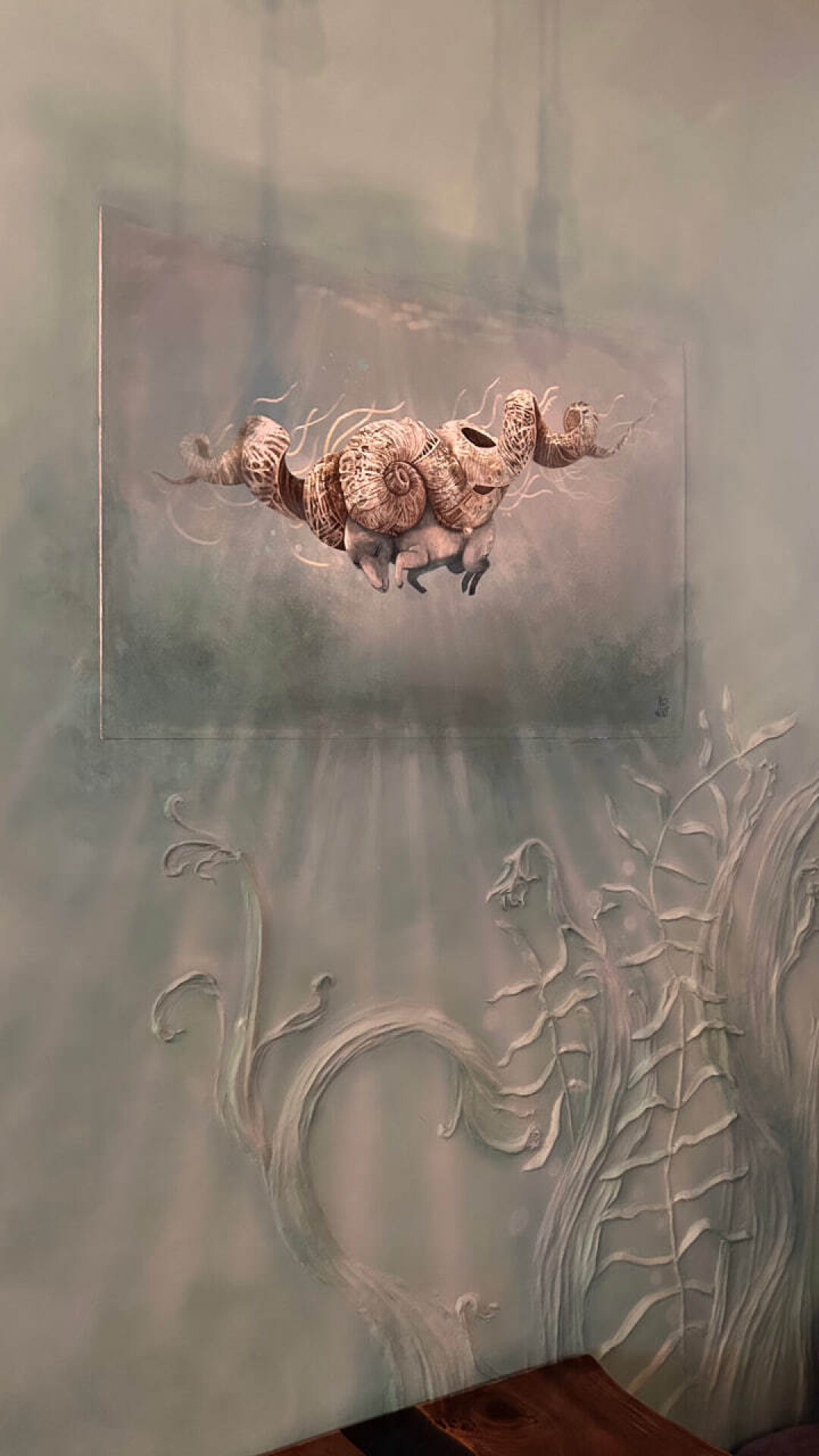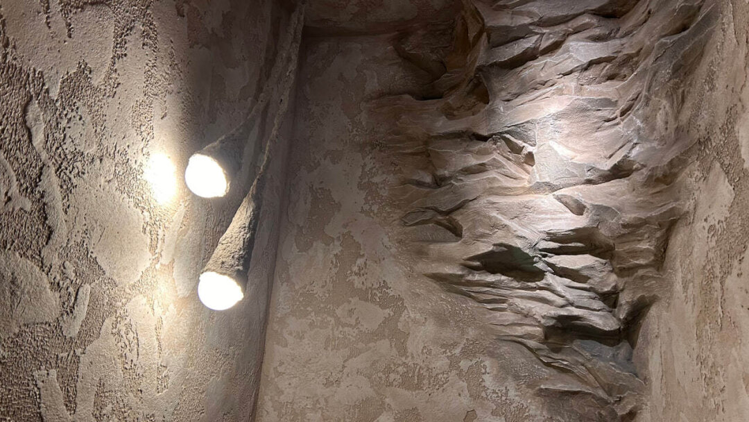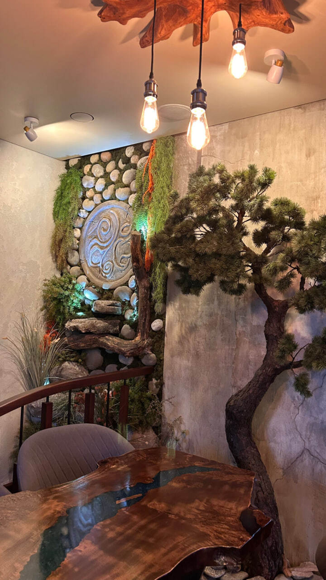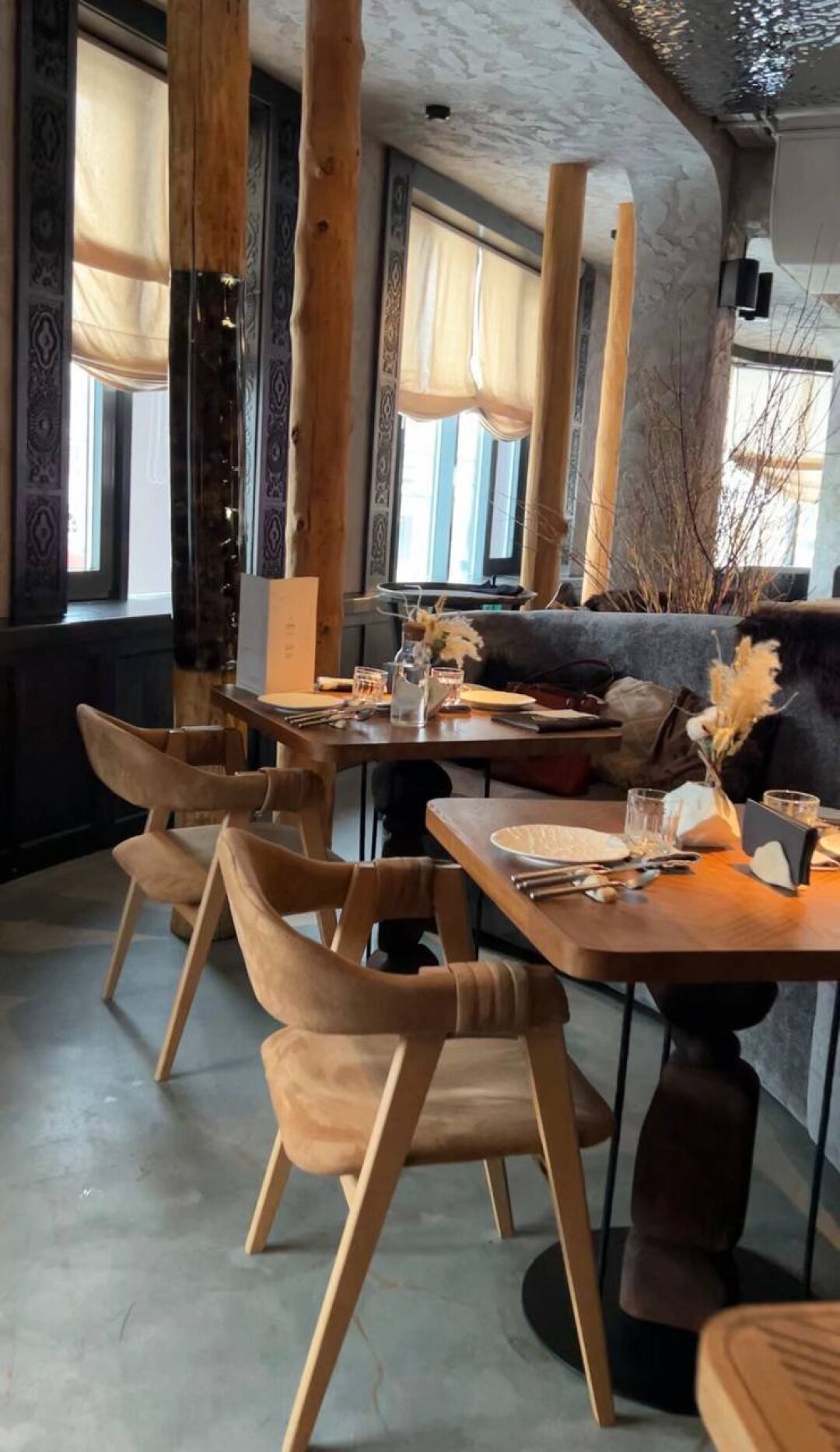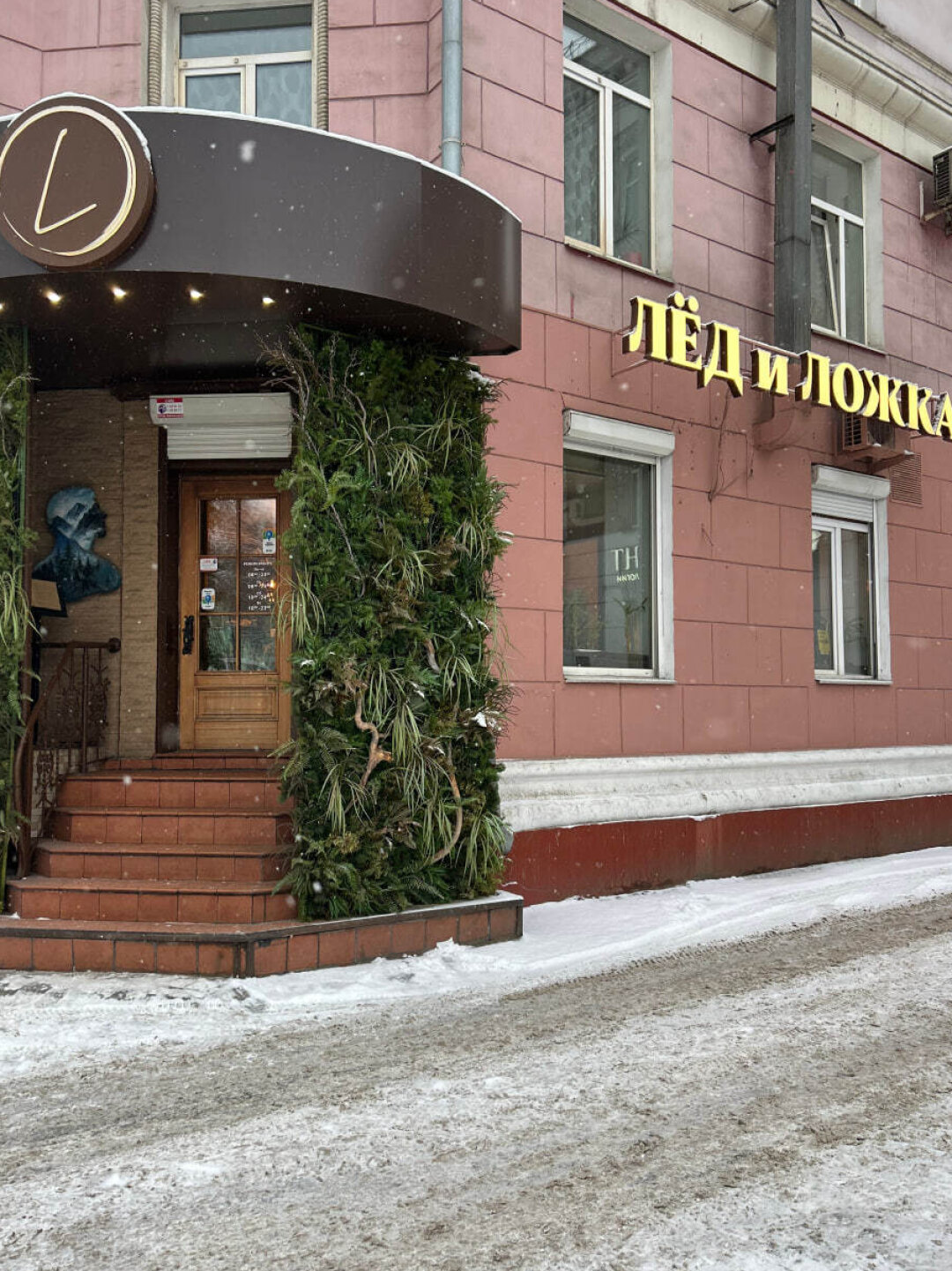 Администратор Андрей провел мне экскурсию по ресторану (приятно!). Владельцы прямо заморочились с деталями. Светильники, подставки для цветов и другие предметы декора выполнены из мха, древесной коры и досок. Картины сестер Ертахановых дополнили (и продолжили!) барельефом на стенах, красиво вписав их в интерьер. Обязательно обратите внимание на столы: вставки из слюды в виде сибирских рек и озера Байкал впечатляют! А чашки ручной работы не хочется выпускать из рук. Молодцы.