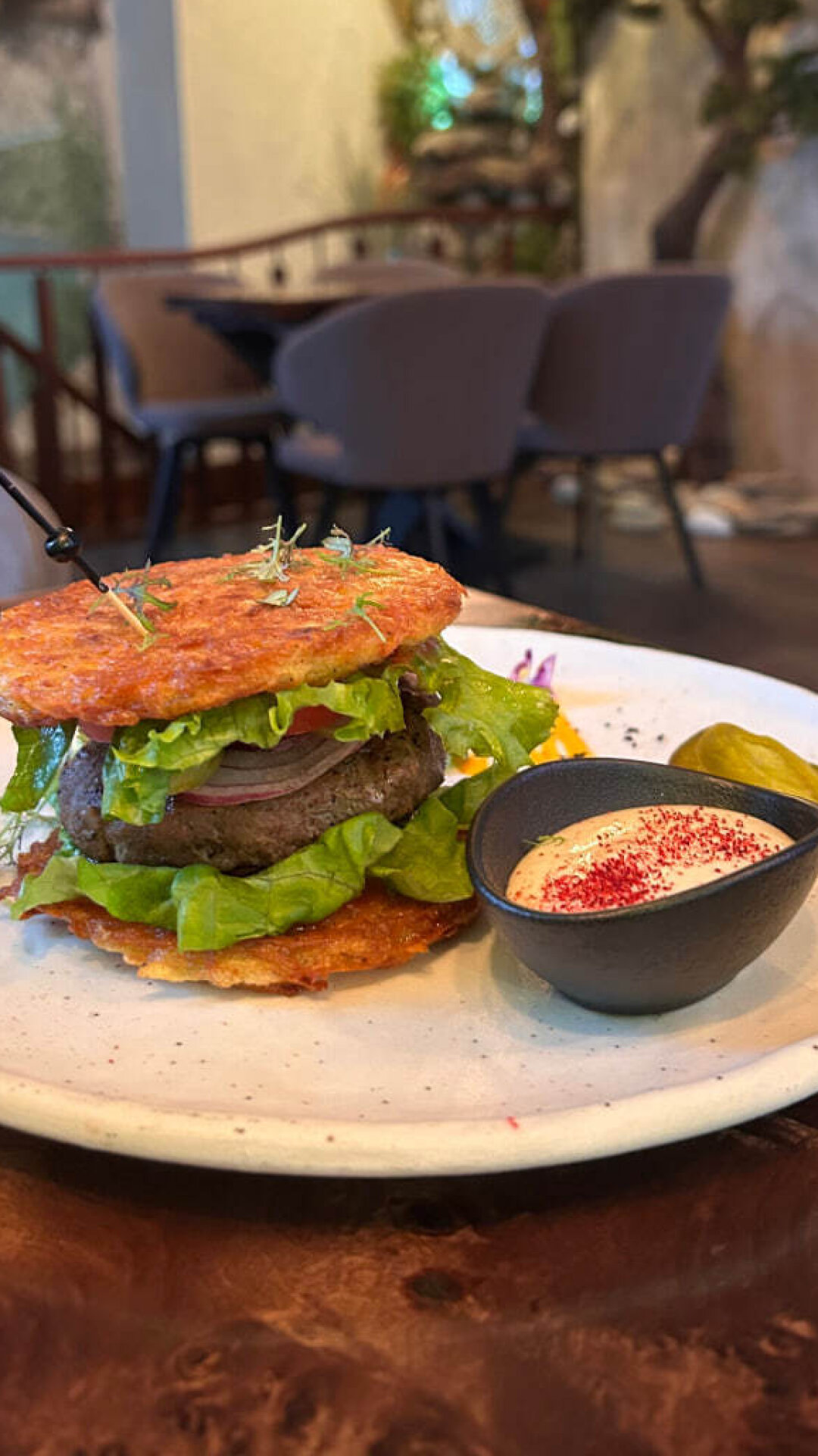 Вот это не просто забавно, но и очень вкусно. Картофельные лепешки — то что надо. Равномерно обжаренные, хрустящие, и мягкие, пряные внутри. Котлета из оленины превосходная: сочнейшая, с пикантным привкусом дикого мяса. Свежие овощи и легкий соус Цезарь чуть нейтрализуют два этих дерзких колоритных (и калорийных!) продукта и получается нужный баланс. Не доела, взяла с собой — ну очень сытно!