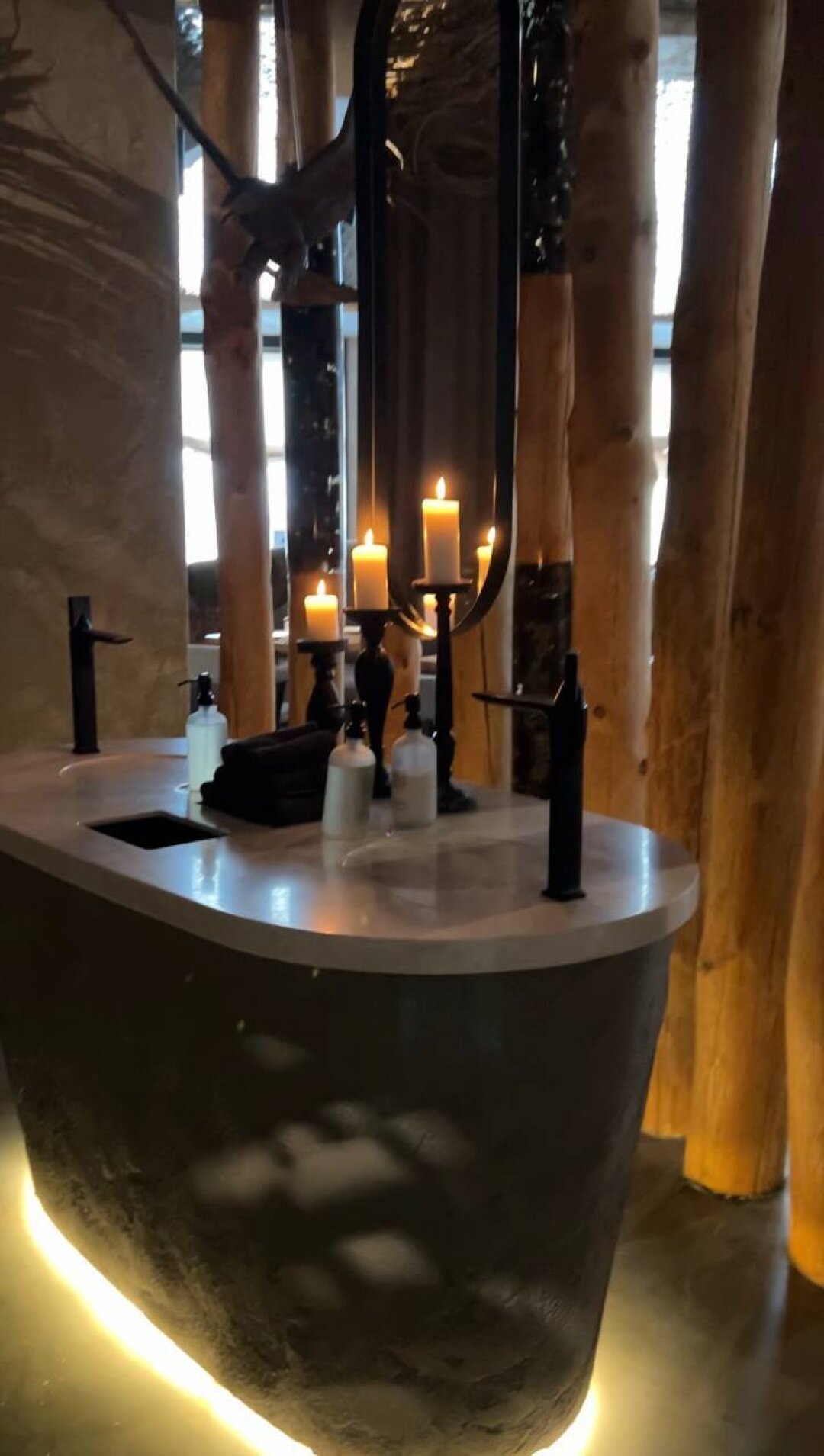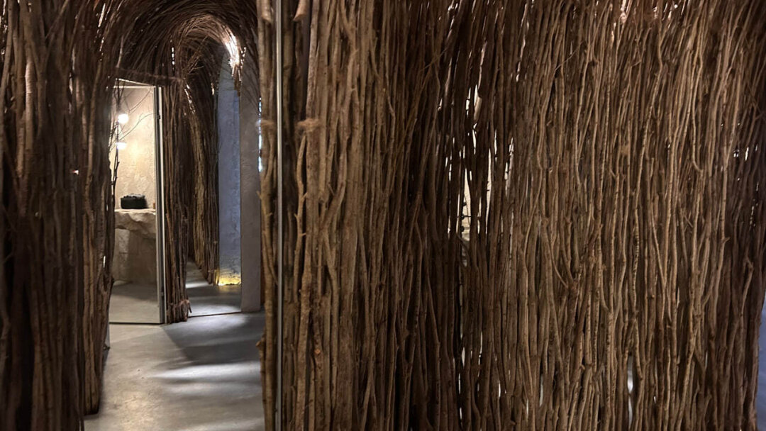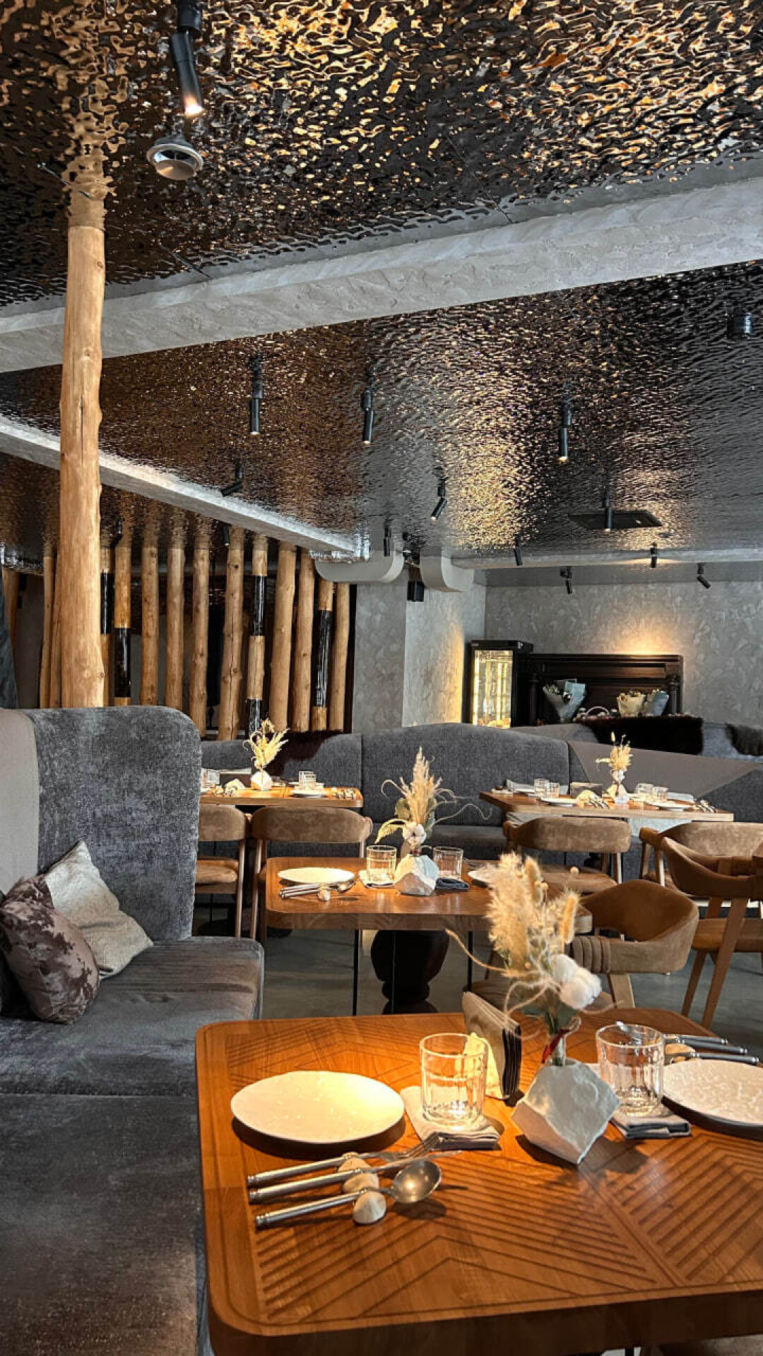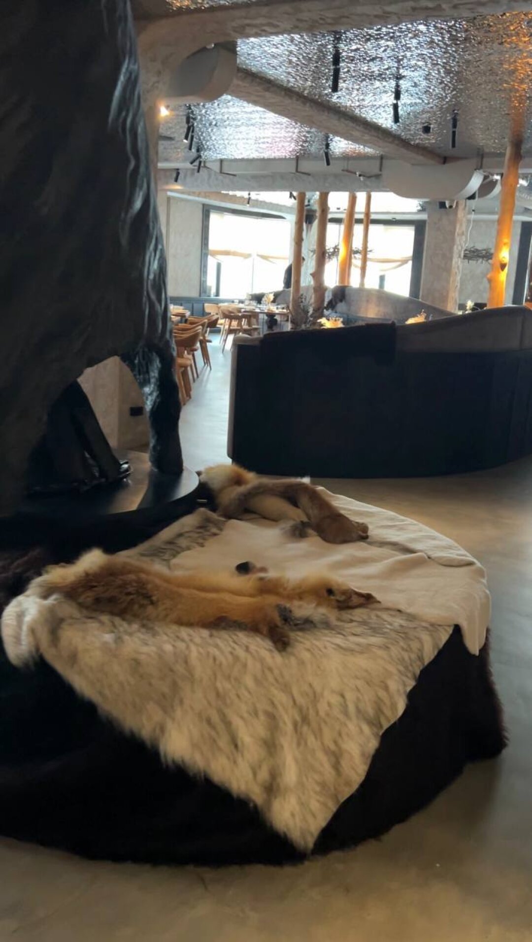 Что касается интерьера. Я бы не стала описывать, просто вставила видео, но на сайте это невозможно, поэтому держите несколько фото. Музыка — лаундж с народными мотивами, стены стилизованы под пещеру, шкуры животных, ветки, дерево — посыл понятен. Просторно, занятно и красиво здесь.