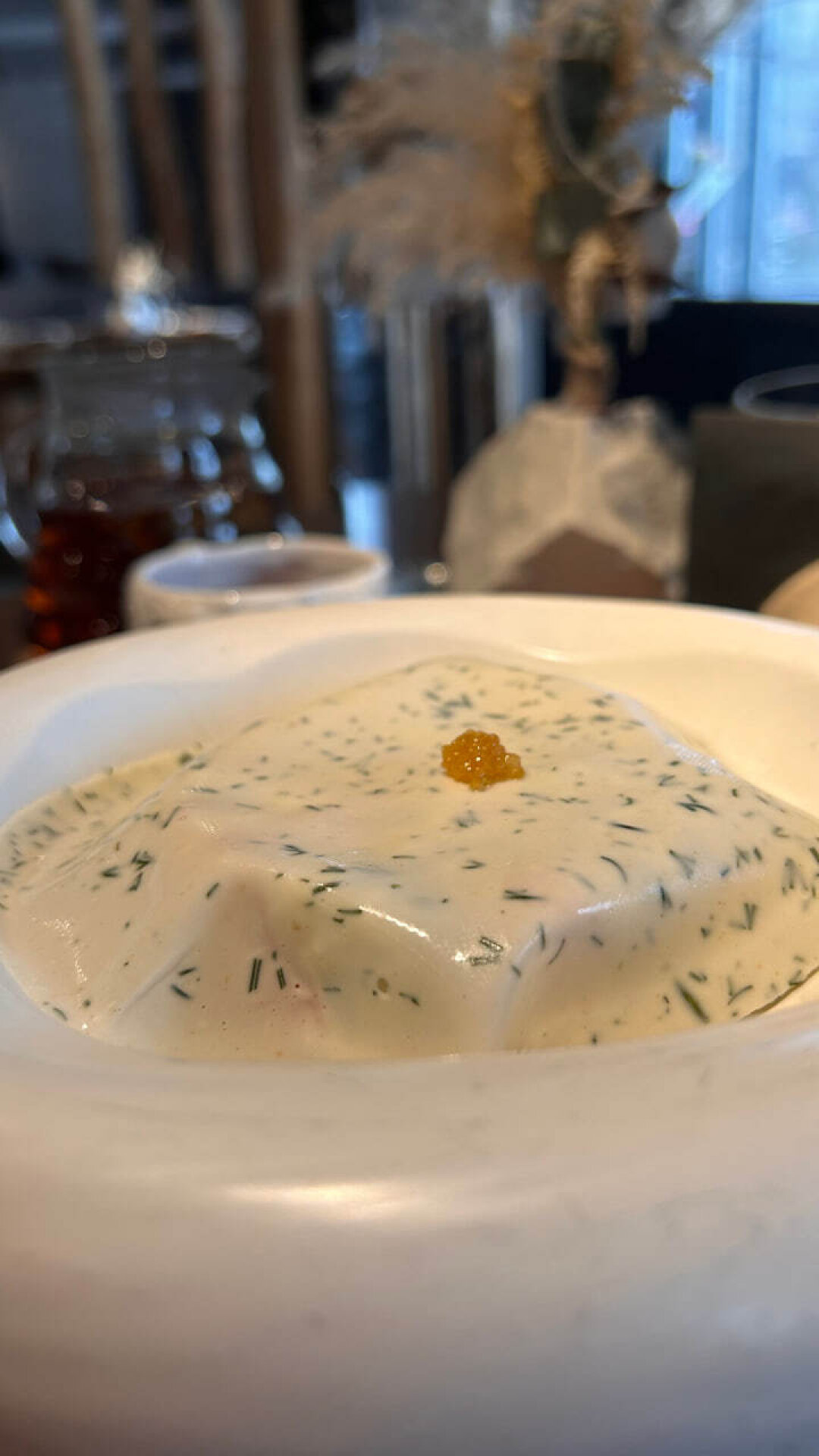 Ох, это вкусно! Тонкое одеяло из картофельного пюре и агара (мне представили его как вуаль, но я обозреватель, я так вижу) покрывало аккуратно нарезанные ингредиенты, пропитанные домашней сметаной. Все, что отвечает за традиционность оливье, было на месте, а копченая рыба придавала блюду новое звучание: приятную соленость, копченость и сибирский шик. Срочно пробовать всем и готовиться к Новому году.