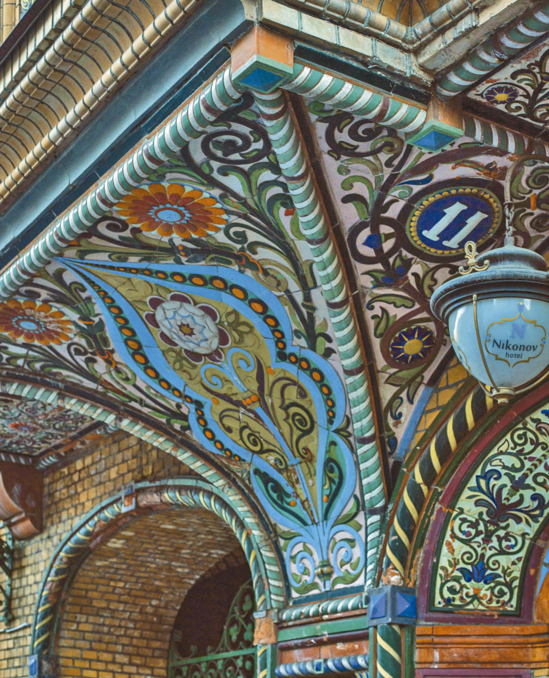 В первом дворе тоже чувствуется неорусский стиль. Стены во дворе также облицованы кирпичом, а на башенке, в которой расположилась винтовая лестница для прислуги, уютно устроились майоликовые вставки с изображением растительных орнаментов, соловьев и петушков. Уникальный «парадный» двор появился в этом доме не просто так, ведь дом состоит из двух корпусов, один из которых полностью зажат в дворовых пространствах. Чтобы жилье не упало в цене, Никонов объединяет два корпуса винтовой лестницей, а двор наряжает в неорусском стиле. В доме есть еще и второй двор, но здесь уже жила прислуга, от чего складывается ощущение, что этот корпус принадлежит совсем другому дому.