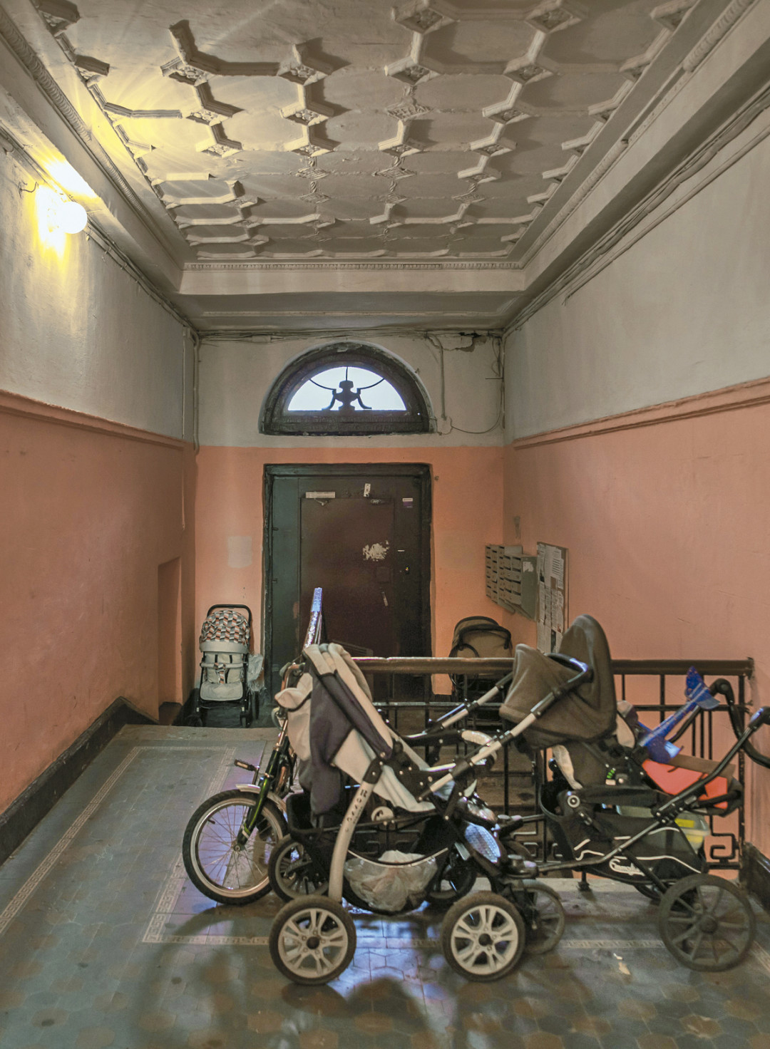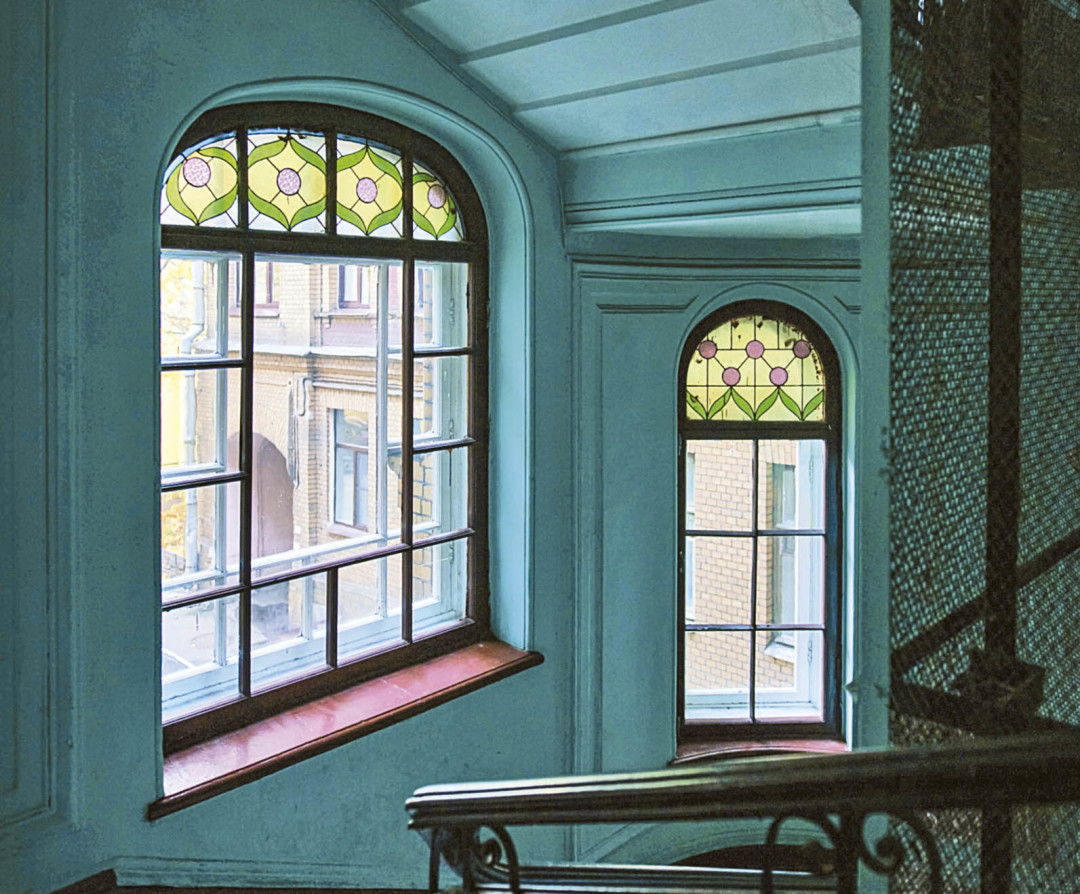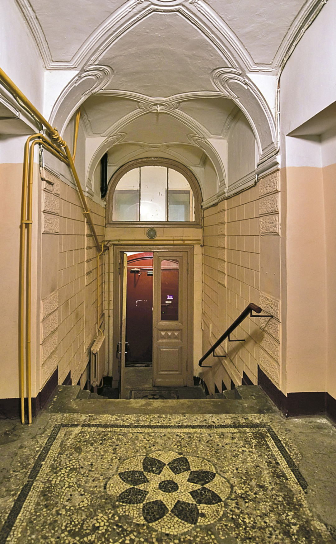 В парадном («Парадное», по Ожегову, происходит от словосочетания «парадное крыльцо». Вариант «парадная» допустим только в разговорной речи. – Прим. лит.ред.) вас встретят «ковры» из метлахской плитки производства харьковского завода «Товарищества барона Эдуарда Бергенгейма». Эта плитка была весьма доступна — по сравнению с конкурентами она стоила в два раза дешевле, — поэтому в петербургских парадных нас часто будет встречать плитка именно этого производителя. Изюминкой парадного являются частично сохранившиеся витражи на окнах с изображением кустиков черники и других растительных орнаментов, а также оригинальные дубовые двери с аутентичными номерными знаками и дверными ручками.