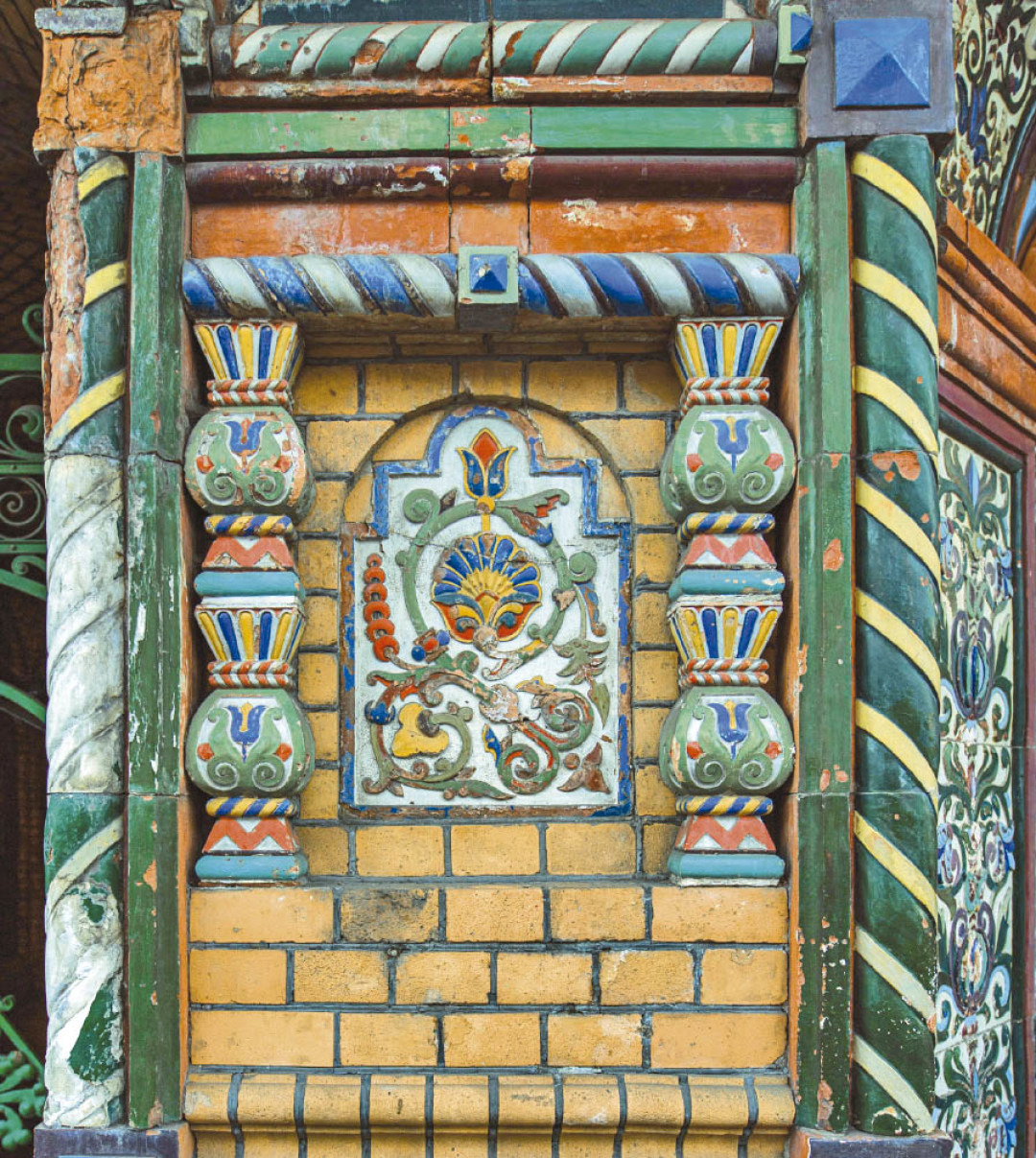 Конечно же, Никонов построил свой дом в своем любимом неорусском стиле, который в итоге стал иконой этого стиля в светской архитектуре. Фасад дома украшают оголенный кирпич и майоликовые вставки. Наличники окон напоминают кокошники из русских сказок, а шатровая крыша придает дому романтичный вид.