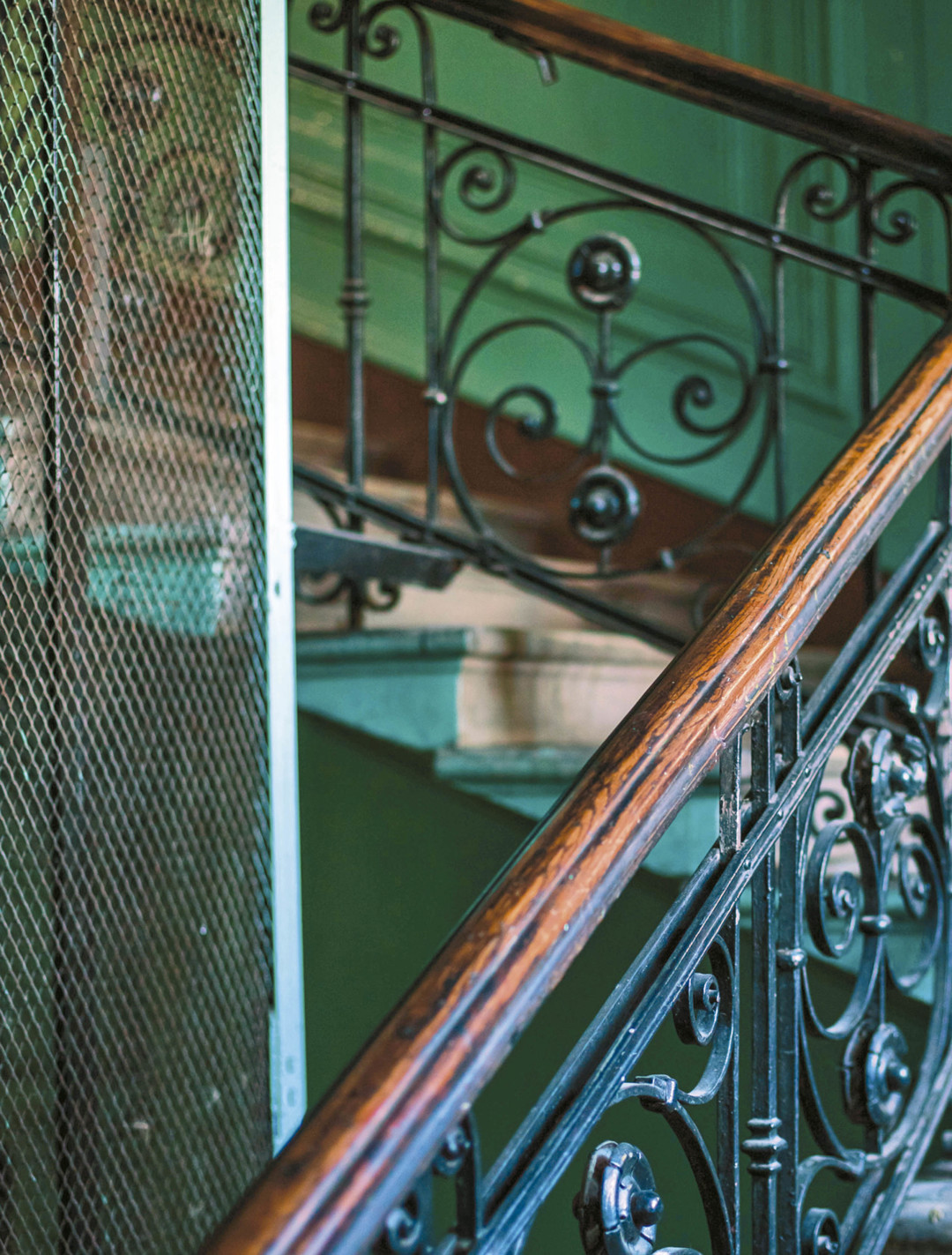Ранее в парадном располагался диковинный пассажирский лифт с роскошными ажурными оградами, но, увы, сейчас на его месте расположилась уже новая шахта лифта, значительно уступающая в изяществе. Если подняться по винтовой лестнице с оригинальной чугунной оградой на последний этаж, то перед вами откроется потрясающий вид на купол музея Арктики и Антарктики и мансарды старообрядческого доходного дома.