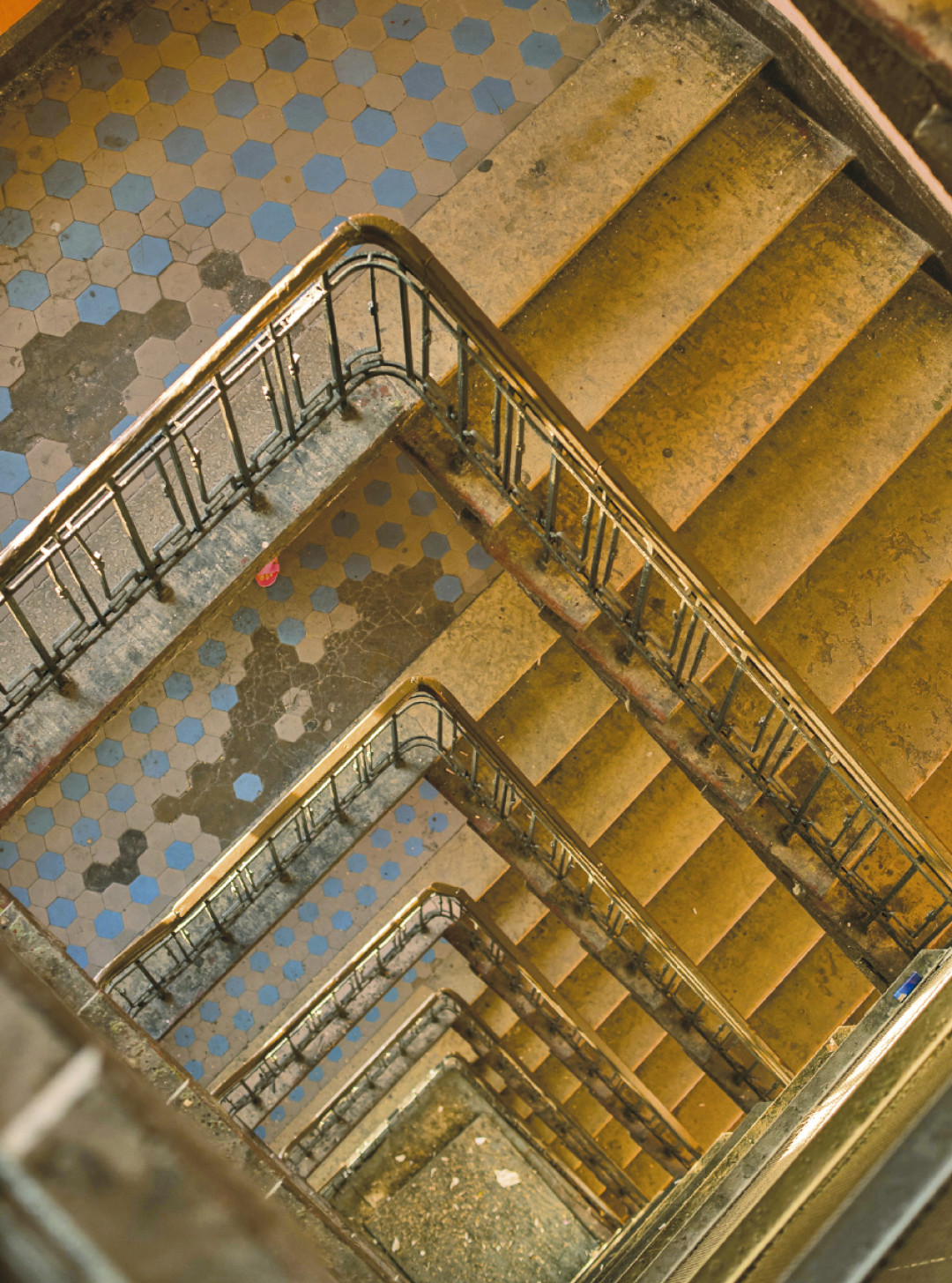 Зайдем же в парадное. Зная Шрётера как экономного и рационального архитектора, конечно же, не стоит ожидать в парадной богатого убранства. Все просто, но со вкусом. Встречает нас парадный вестибюль со сводчатым потолком и отделанные рустом стены. Пол же выстлан любопытным мозаичным панно из мраморной крошки — так называемое тераццо. Главным же украшением парадного стала винтовая лестница причудливой формы с чугунными балясинами.