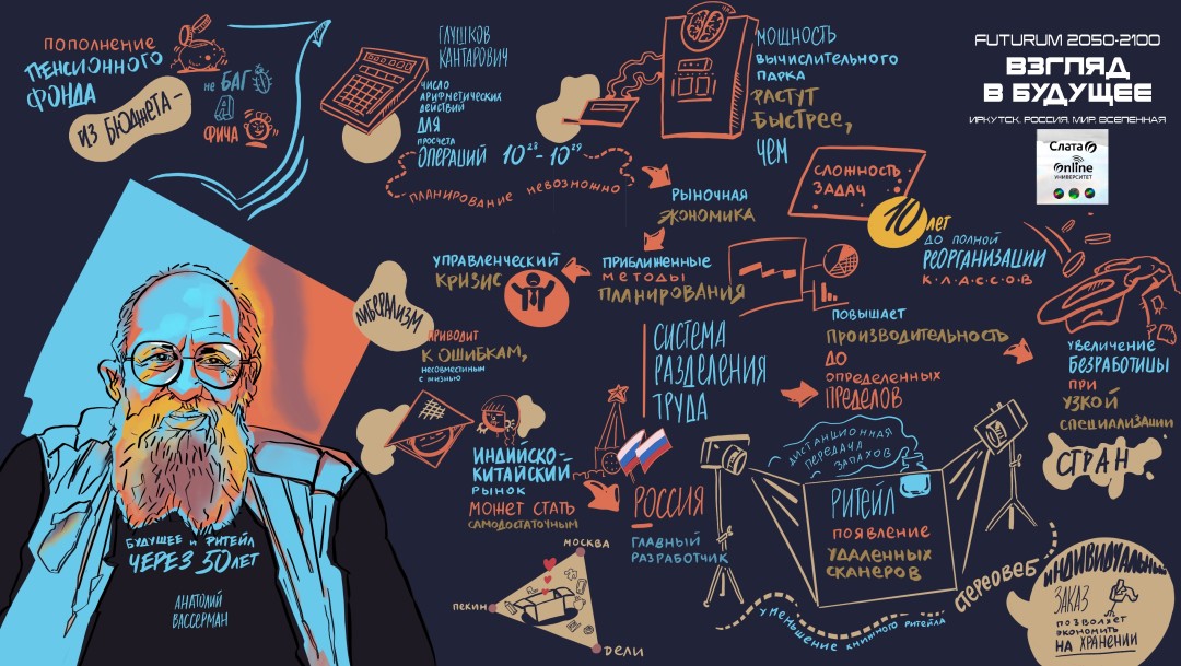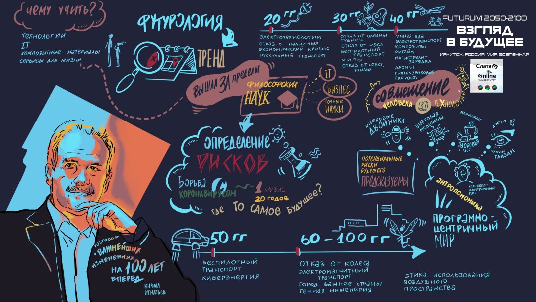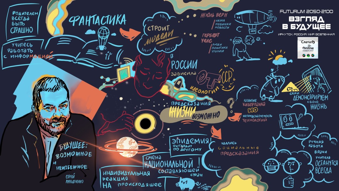 Футурологическая конференция «Futurum 2050–2100. Взгляд в будущее: Иркутск. Россия. Мир. Вселенная» состоялась в онлайн-формате в пятницу. Семь известных спикеров: российские футурологи, писатель-фантаст, журналисты, философы, художники – выступили перед 350 сотрудниками сети «Слата» из Иркутска, Красноярска, Хабаровска, Читы, Братска, Москвы, Варшавы.