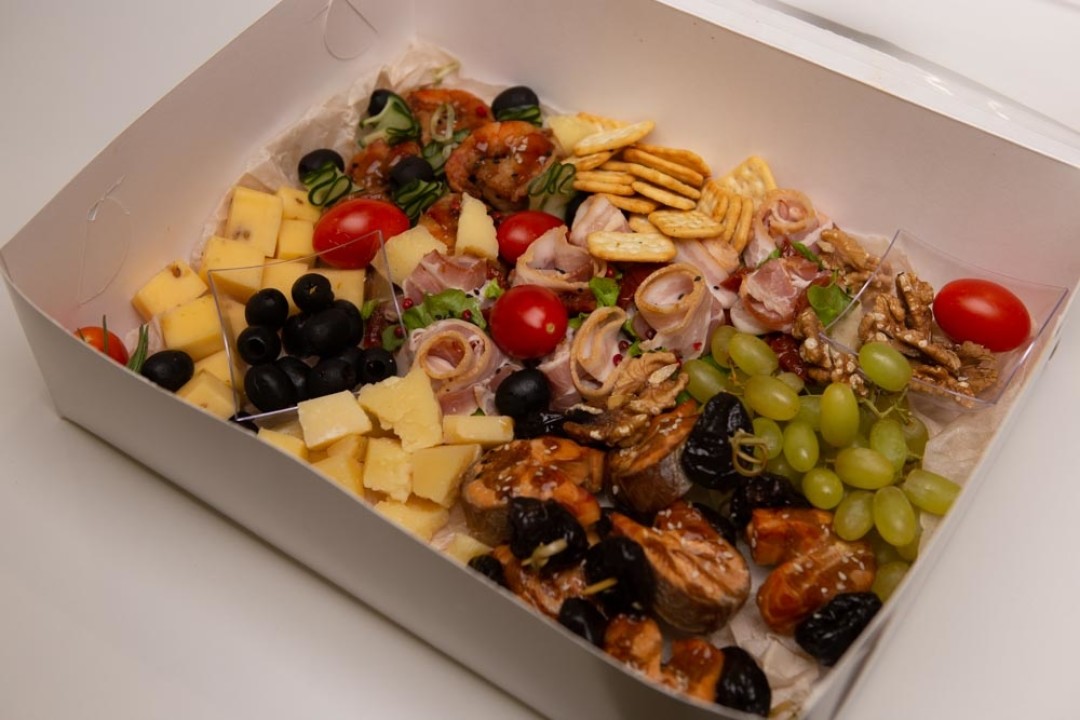 Среди гурманских предложений: White-бокс** – запеченные мидии, салями и снеки, сыры твердых сортов и вяленые томаты и, акцентно, – фрукты, орехи, мед. Red-бокс*** – копченая семга с черносливом в соусе терияки, копченые креветки в кисло-сладком соусе, брускетта с сырокопченым беконом, а также твердые сыры, виноград, грецкие орехи и маслины. В набор «Барбекю-бокс» вошли шашлыки из свинины и куриной грудки, крылышки гриль, запеченные на гриле цукини, гренки, зелень и овощи. Также есть боксы для сладкоежек «Итальянский» и «Праздничный». В среднем цена гастрономических боксов 799-1399 рублей.