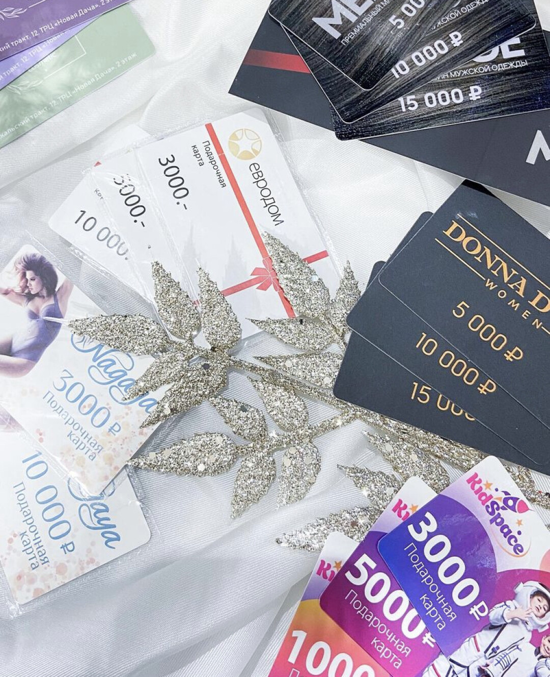 В магазинах ТРЦ «Новая дача» можно выбрать подарки на любой бюджет. Например, приобрести сертификат или собрать подарочный набор из магазина косметики на сумму от 800 рублей, полетать в аэротрубе от 1400 рублей или купить, например, сумочку за 20 000 рублей.